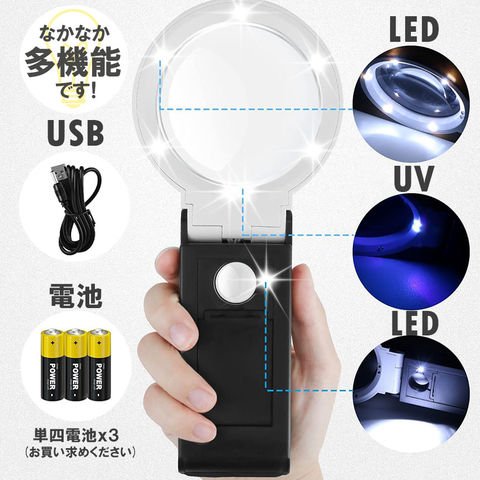 ・大レンズにLEDライト5つ、小鏡に1つ付き。3つの照明モードを切り替えて、暗い場所でも読書が可能で、デスクライトとしても便利です。UVライトで蛍光浸透傷のチェック、紙幣、骨董の鑑定などに使えます。