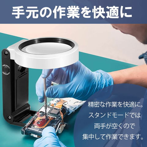 段階適角度調節可能、手持ち式とスタンド式両方使える拡大鏡!折りたたんだ時に手持ちルーペとして、広げると自立できるスタンドルーペ、2wayで読書や作業する時にとても便利です。