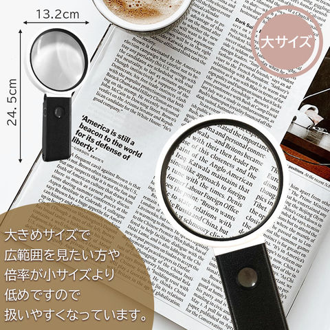 ・2種類のレンズ搭載で軽く、長時間で使用しても腕が疲れにくいです。6倍もしくは3.5倍の大レンズは新聞、雑誌、譜面、地図、観察など比較的大きなものを長時間見る時におすすめ!25倍の小鏡は宝石鑑定、骨董品の鑑定や1mm以下の物を見る時におすすめです。