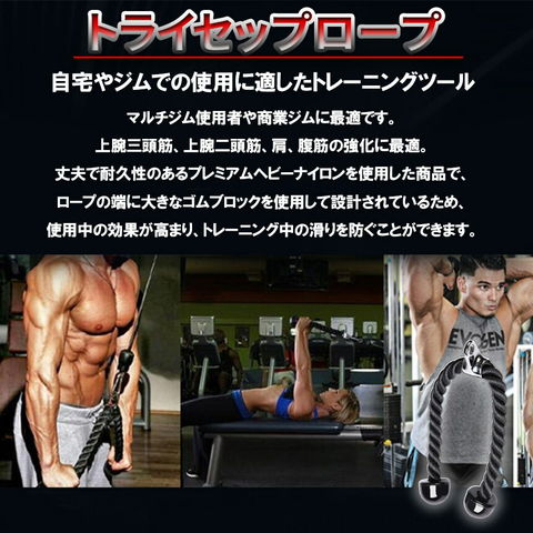 トライセップス・プレスダウンに良く効くアイテムです。またアームカール、腹筋運動にも使えます。ロープを使ったトライセッププレスダウンの利点は手首が自由なことです。バリエーションが豊富で様々なパターンで筋肉を追い込めます。