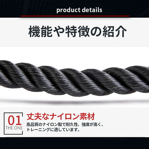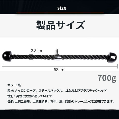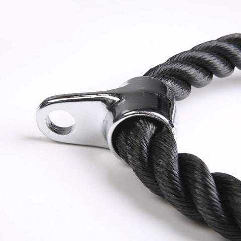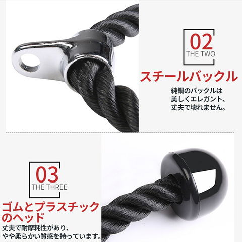 丈夫なナイロン製で耐久性に優れていて、ハードクローム製のスイベルを備えているため、トライセップスプルダウンで柔軟な動きが可能です。編み込みもナイロンは、ワークアウト中に滑ることなくしっかりとグリップでき、継続的なトレーニングでも安定しています。ロープの先端にはプラスチックブロックが付いているので、しっかりと握ることができて滑りにくいです。