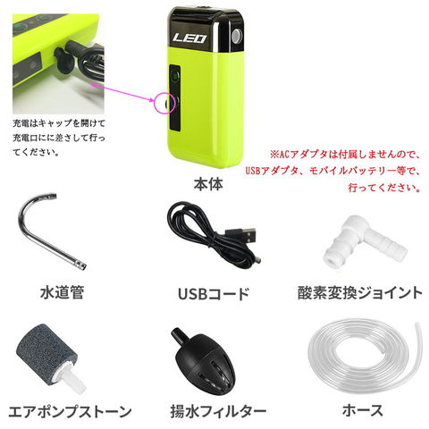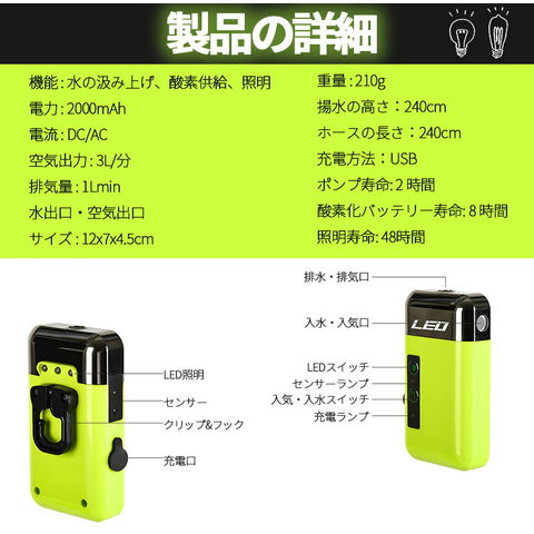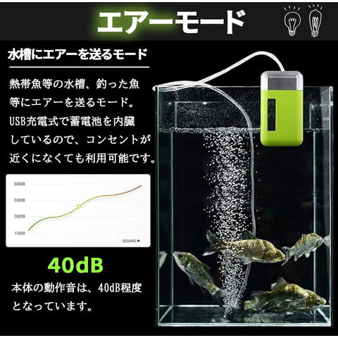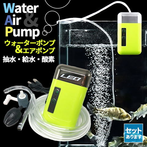 エアーモードでは、水槽への酸素供給用や、釣りなどで釣った魚を活かしておく際などに使用できます。ウォーターモードは、手洗いや給水、水の移動にも使えます。