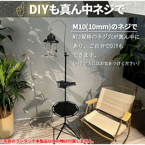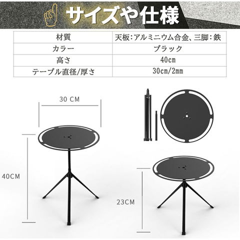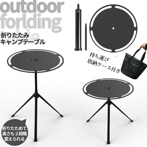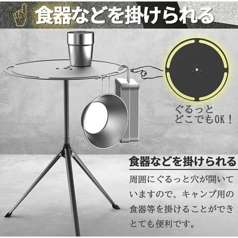 三脚とテーブルが分解でき、コンパクトで、ケース付きなので持ち運びも便利です。組み立て後は約23cm~40cmの高さに調節して使用できます。食器、小物類等を吊るしたりできる穴もあり、使い勝手もとても良いです。