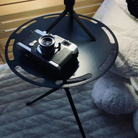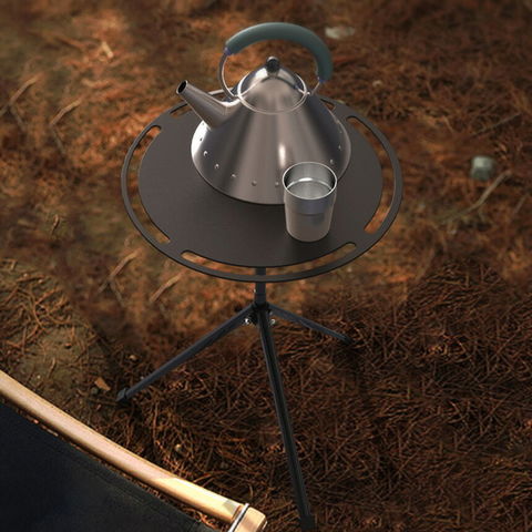 【丈夫なラウンドキャンプテーブル】天板はアルミニウム合金を使用、三脚部は鉄を使用し、丈夫で高耐久なデザインとなっています。テーブル表面は静電塗装で傷がつきにくく、見た目も洗練されています。どんなキャンプ用品にも合わせることができます。テントの内外、室内、焚き火の周り、あらゆる場所で使用可能です。