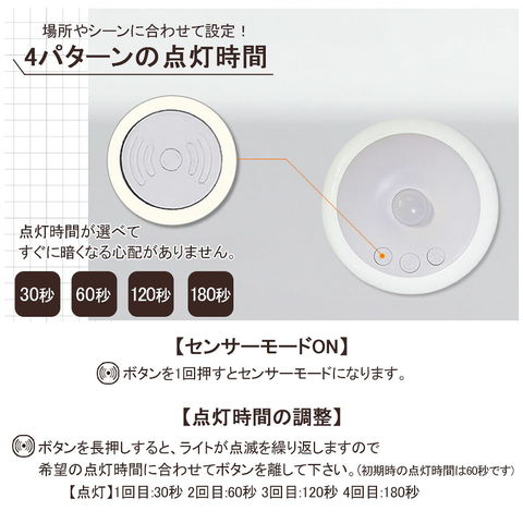 センサーモードには点灯時間を設定することが出来ます。30秒、60秒、120秒、180秒から選べてすぐに暗くなる心配がありません。また常灯するより省エネ効果が得られます。