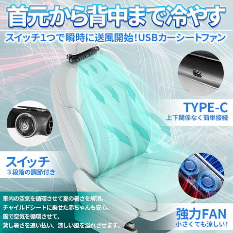 【2個セット】車用シートファン 扇風機 2色 ブラック ホワイト USB ヘッドレスト コンパクト 3段階風量調節 車載 送風機 シートクーラー 背中 首もと 涼しい 空調 暑さ対策 ベビーシート カー用品 車載シートファン 取り付け簡単 蒸れる 汗 快適 クーラー エアコン 工事不要のレビュー