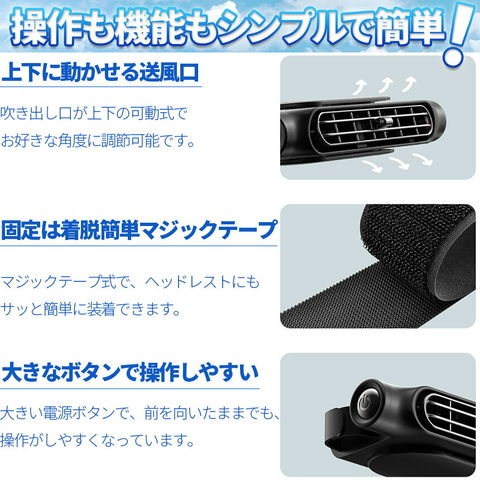 取り付けは、ヘッドレストにマジックテープでサッとつけるだけ♪付属のUSBのコードでつないで大きくて押しやすい電源を入れればあっという間に送風開始。3段階で風量も調節できます。乗ってすぐの熱い車内で首元から体温を下げる、エアコンをいつもより弱めて省エネ、あると必ず役立つ便利グッズです♪