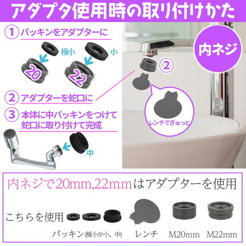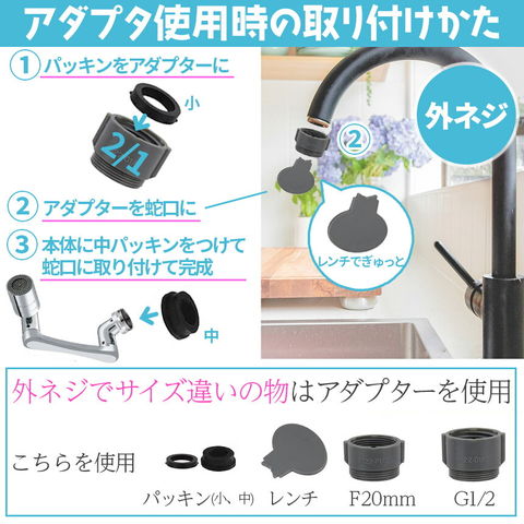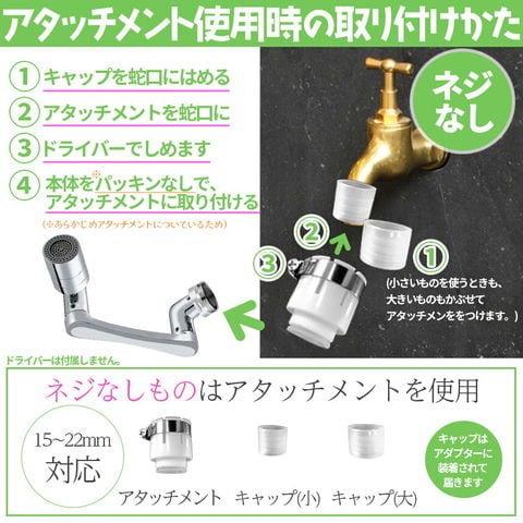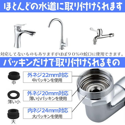 必要なすべてのアクセサリが付属しています。蛇口にネジ式の口を回すだけで設置でき、配管工は必要ありません。 家庭でのほとんどの蛇口に適しています。また、水漏れ防止テープもついているので、気になる場合は、ネジ部分に数回巻いて、それから取り付けてみて下さい。(※適応しない蛇口もあります、画像の説明をご覧になって、ご家庭のものが適応するかご確認くださいませ。)