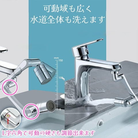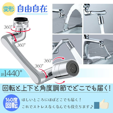 あらゆる箇所が360度回転し、水流の方向を自由に変更できます。特にシャワーモードではシンクの掃除も隅々までとってもしやすいです。また、上向きのもなるのでそのまま顔を洗ったりできます♪