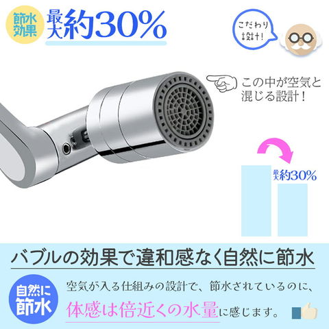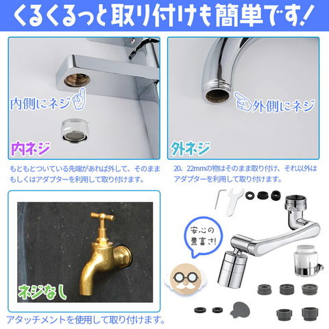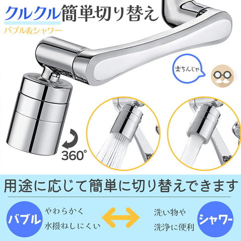 【ぐるぐる自由自在!キッチンシャワー】SNSでも話題!バブルとシャワーの2WAYで360°x4か所首が回り、角度も変えられる、ほとんどの蛇口に適用する高機能ヘッドです♪バブルで優しく&シャワーで勢いよく!の2WAYがいいんです!外ネジタイプ、内ねじタイプ用アタッチメント、万能アタッチメントが付属するので、ネジがないタイプも対応(約1.5cmから2.2cmまで)可能です。