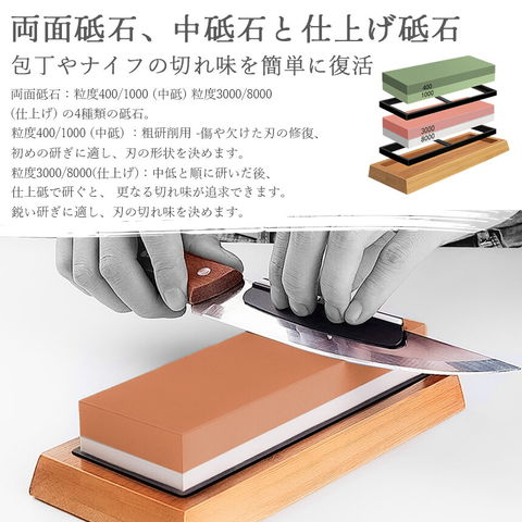 両面砥石は中砥石「400/1000」と仕上砥石「3000/8000」が揃ったセットになります。