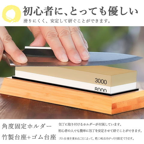 包丁に取り付ける研ぎ角度固定ホルダーの付いた砥石です。初心者の方でも簡単に15°の角度で包丁を研ぐことができます。ホルダーがあると包丁を研ぐときに包丁の角度を一定に保てるので綺麗に砥ぐことができます。