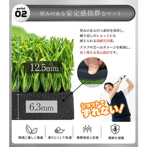 しっかりとした厚みのあるベース素材を採用し、繰り返しのショットにも耐えられる高耐久仕様。クラブや芝へのダメージを軽減し、長く使える安心設計です。