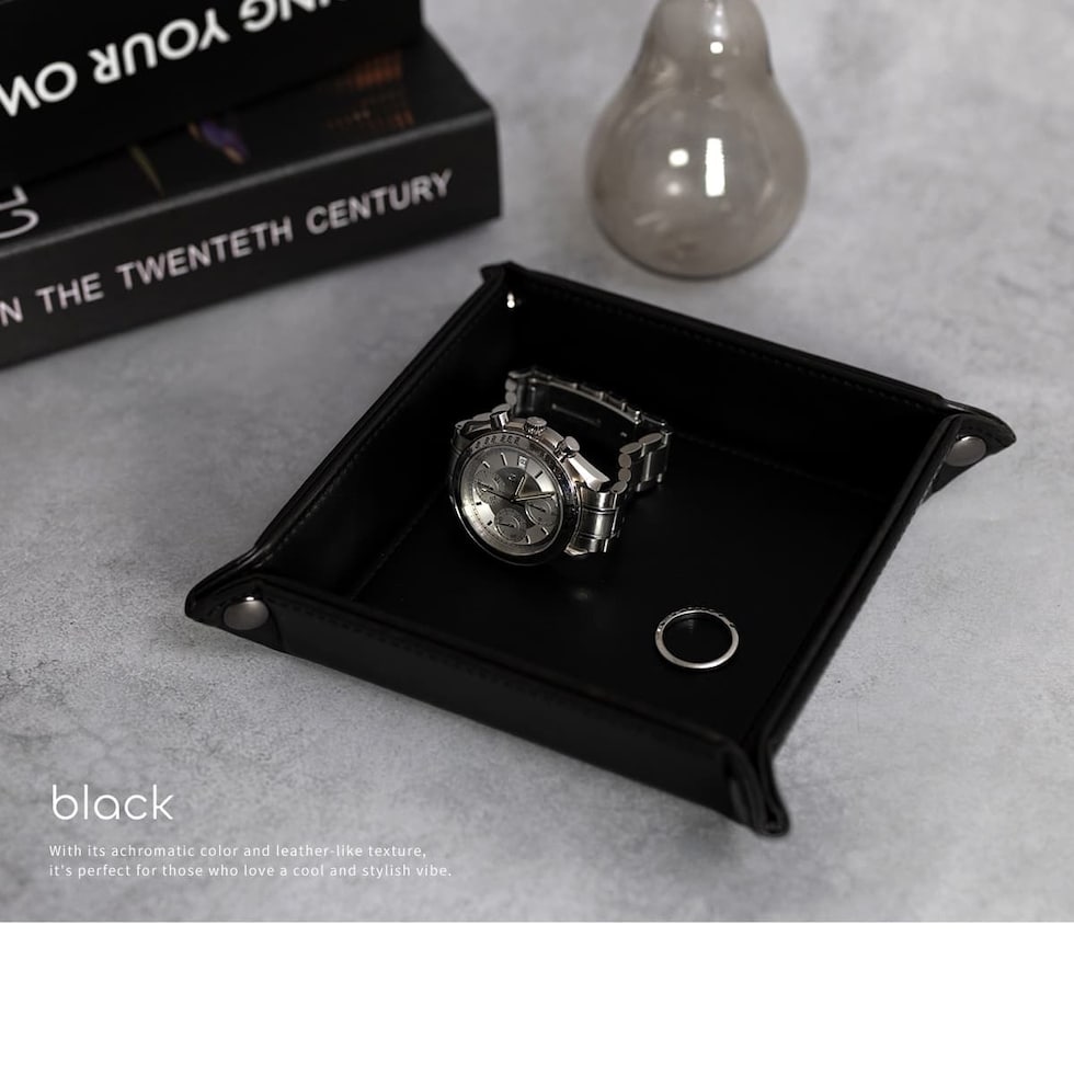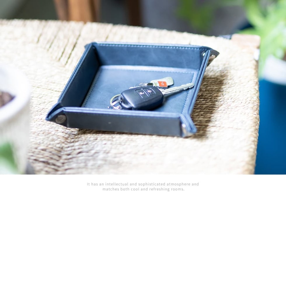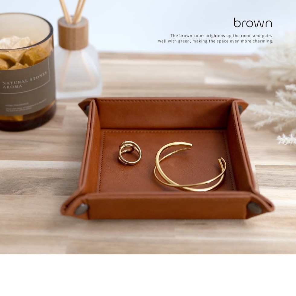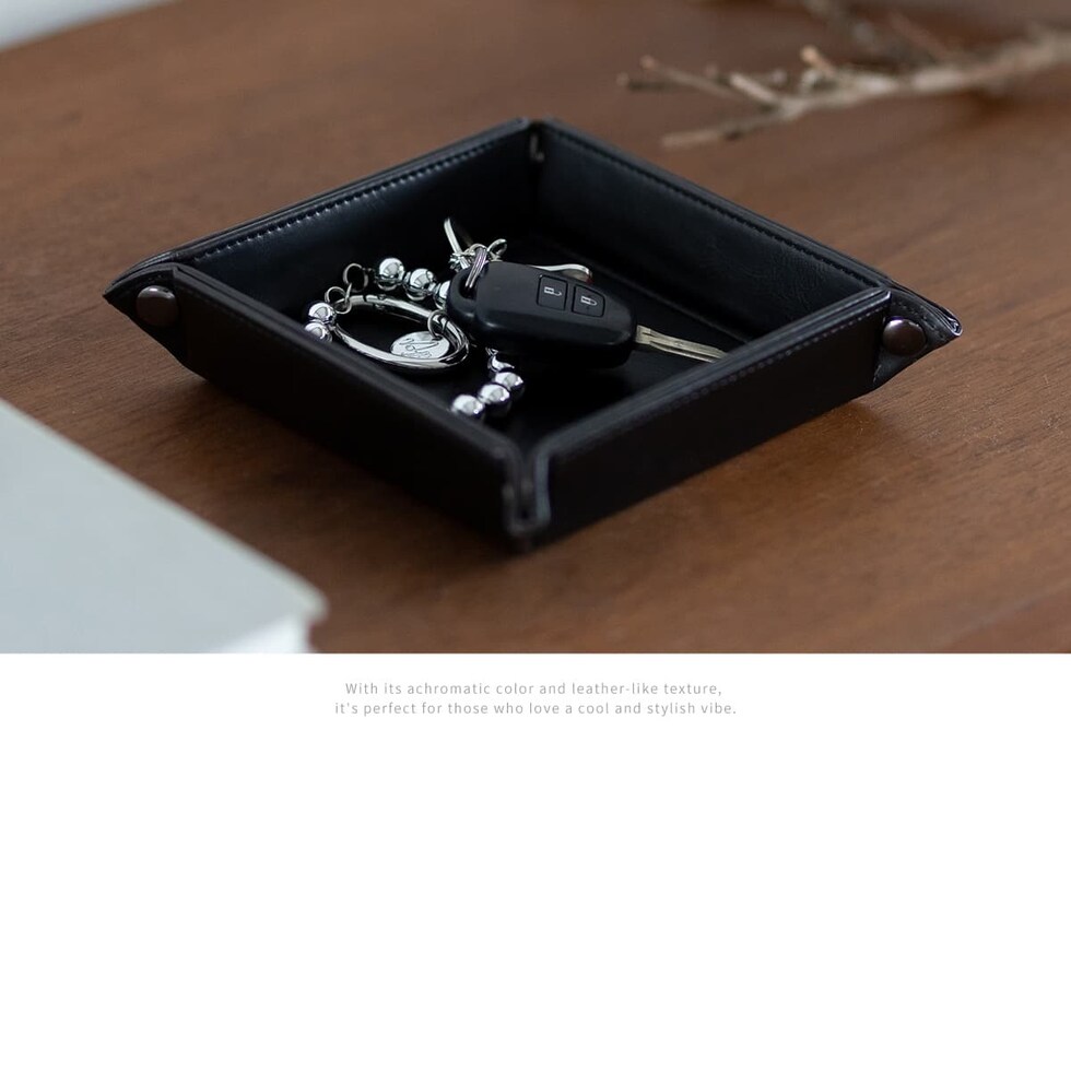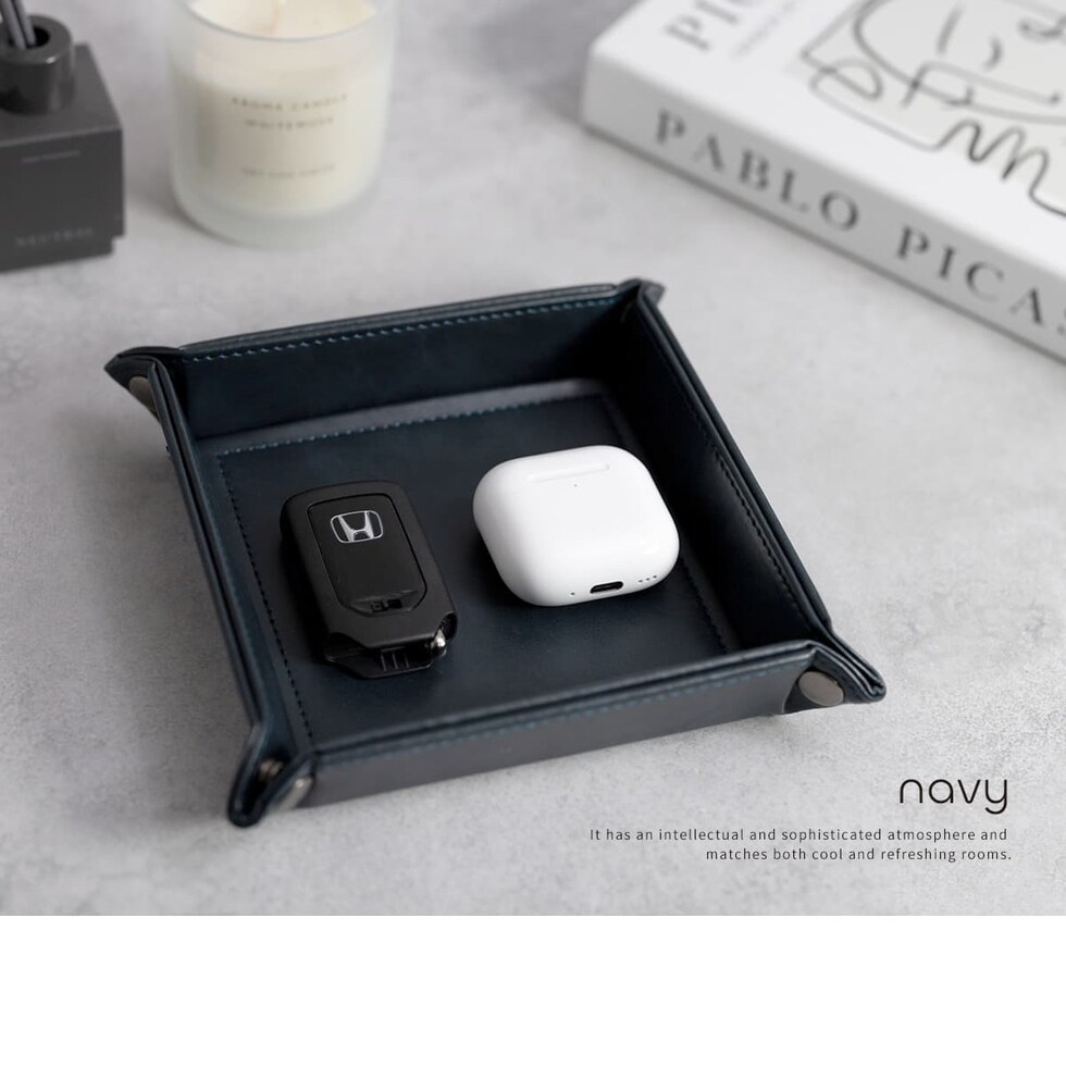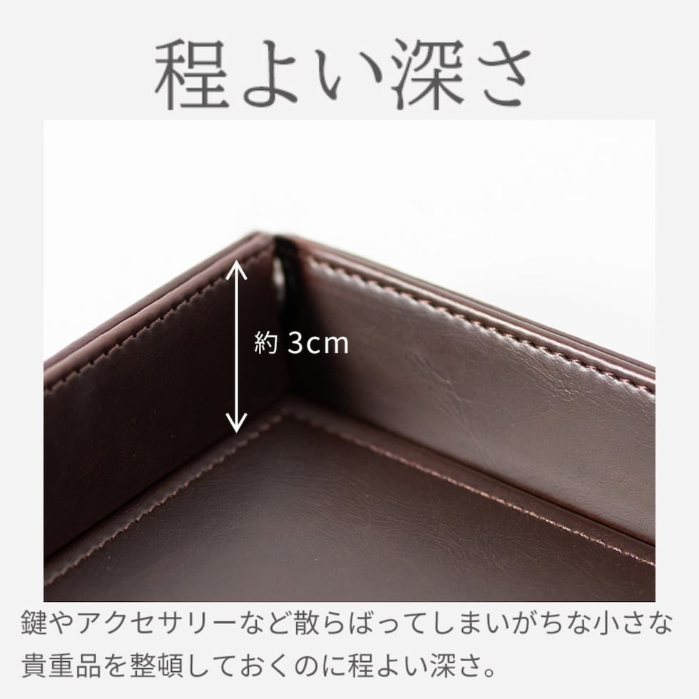 鍵やアクセサリー、小型のデジタル機器など、散らばりがちな貴重品の整頓にぴったりなレザー調トレイ。