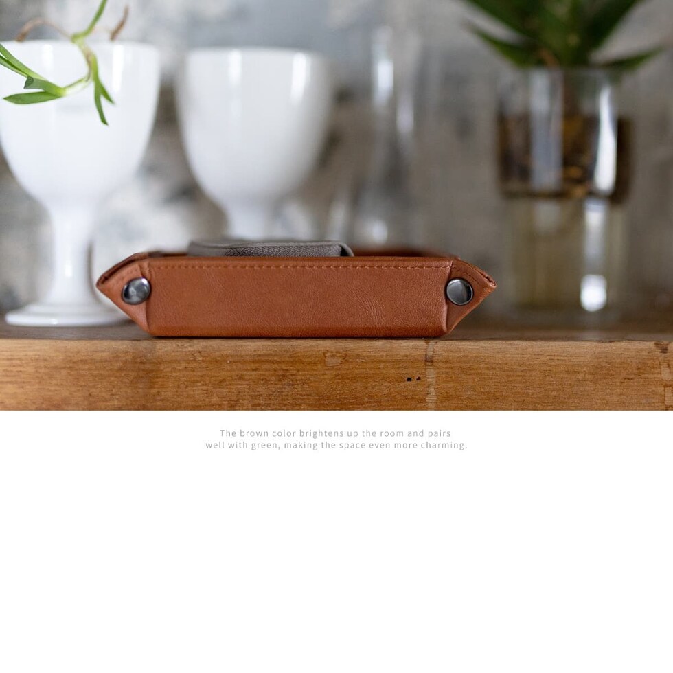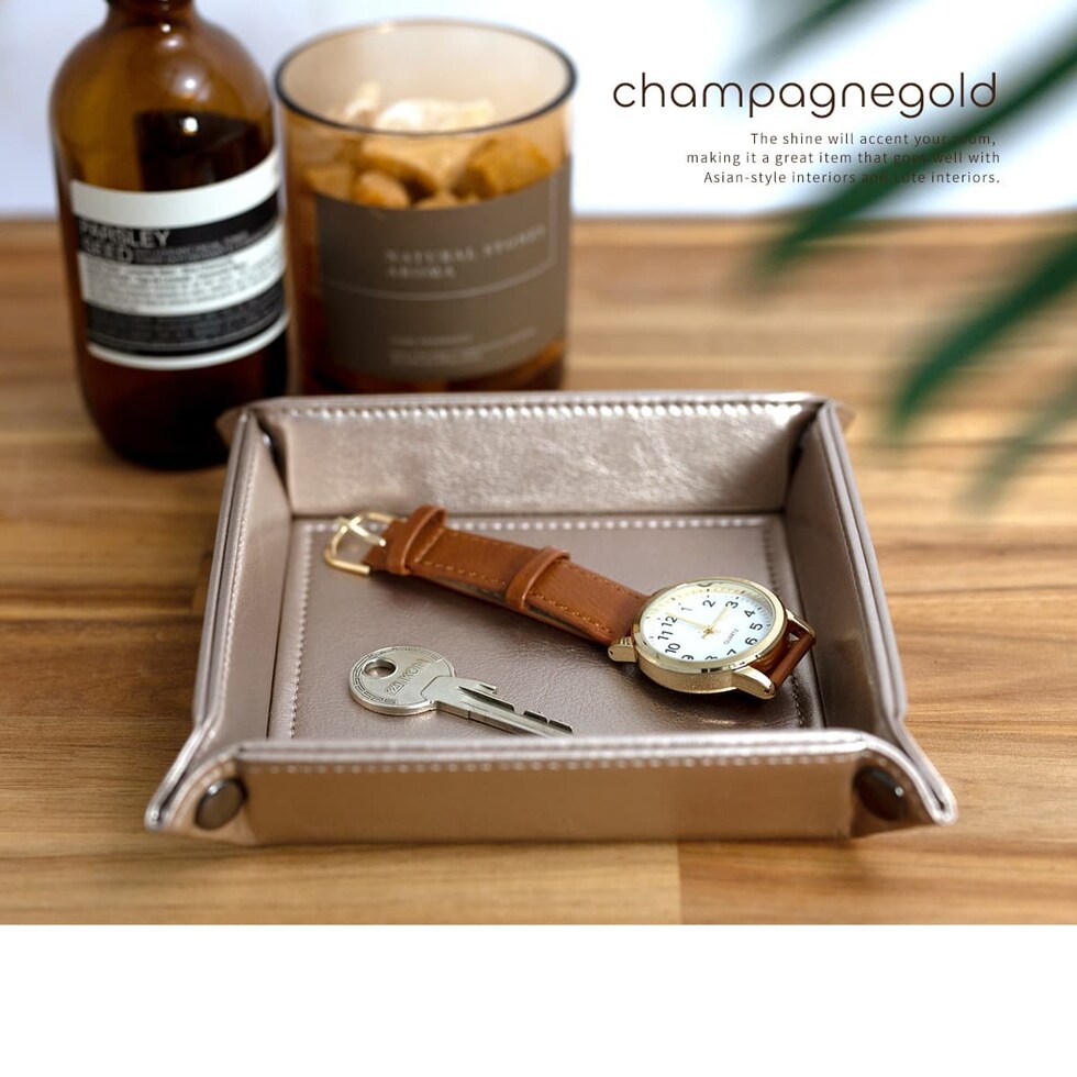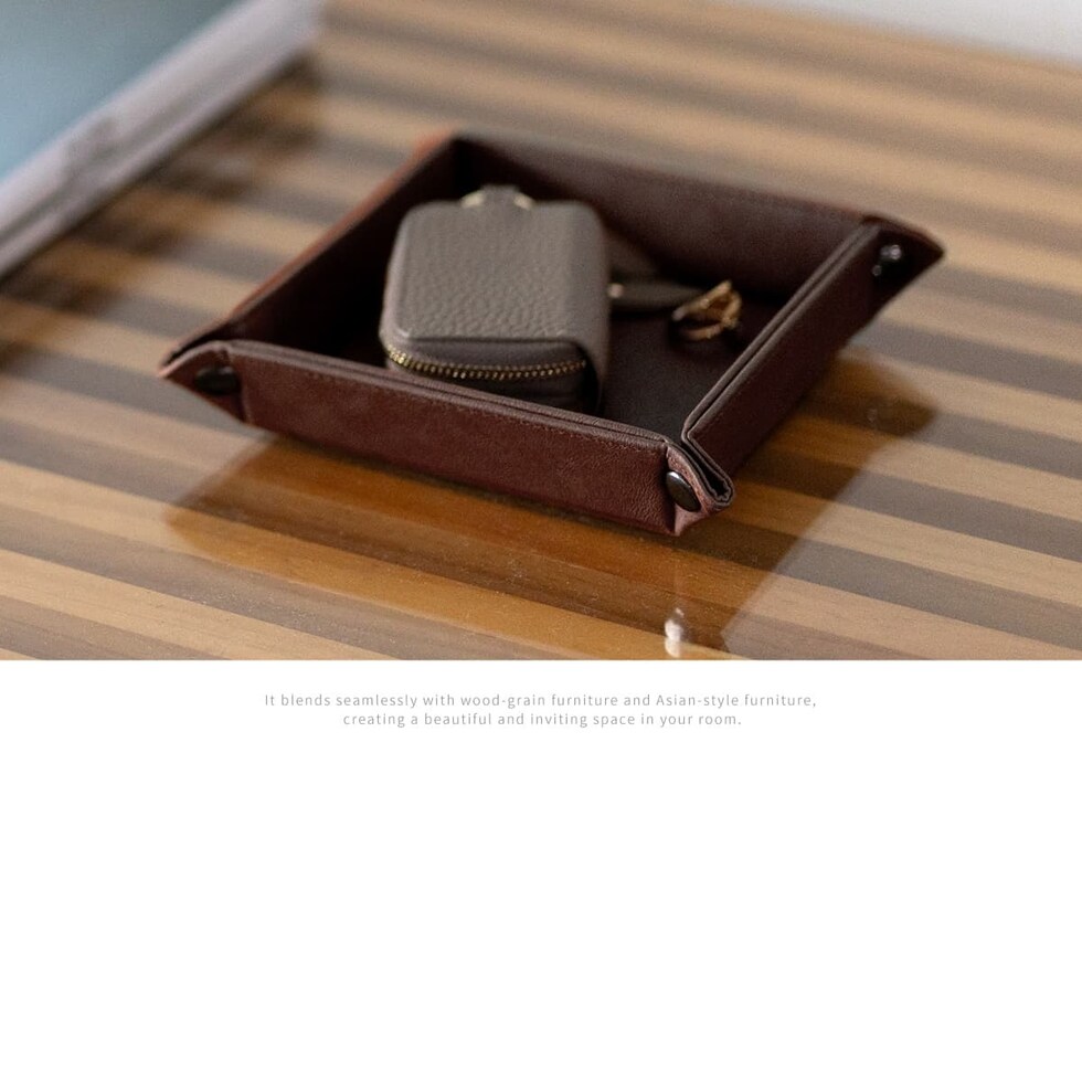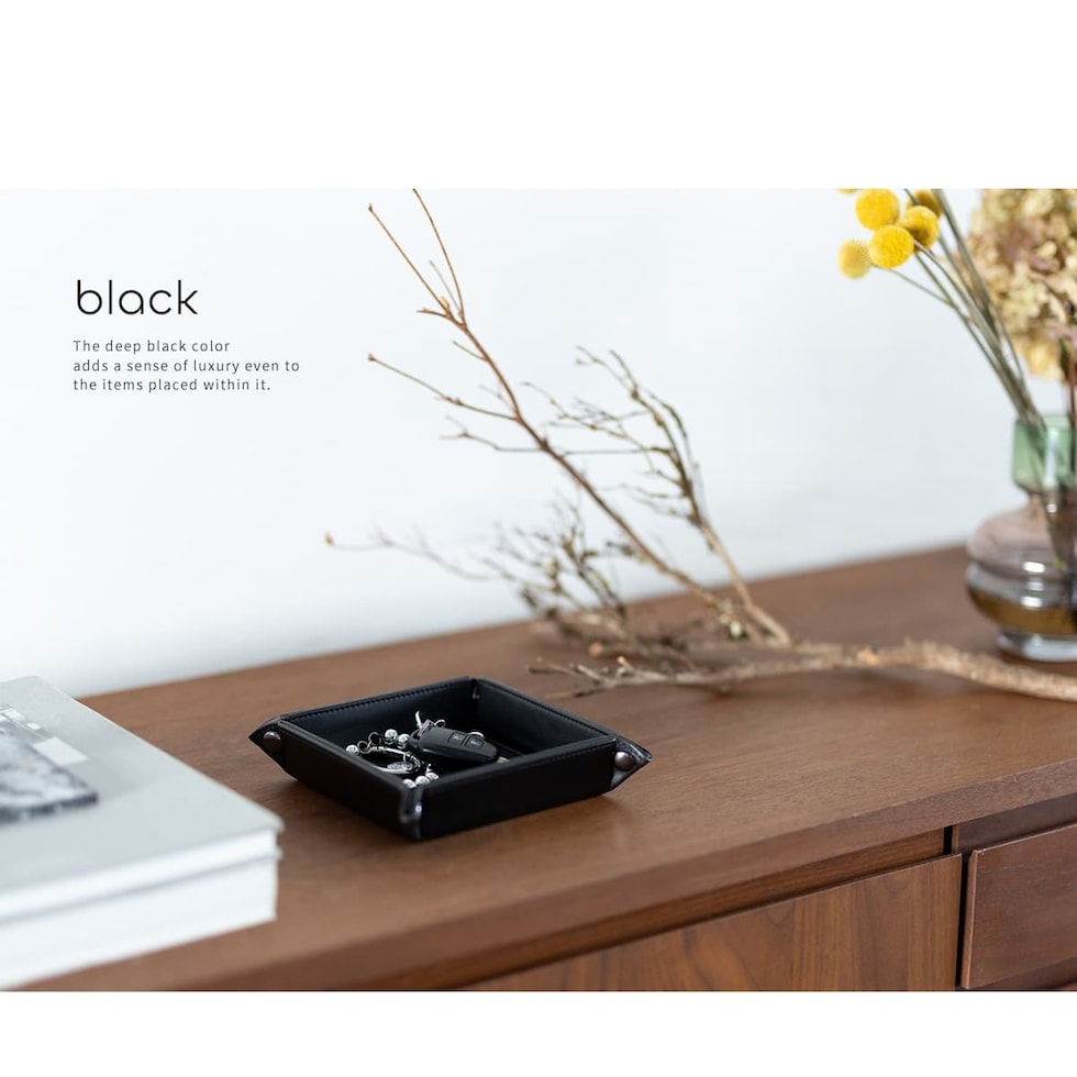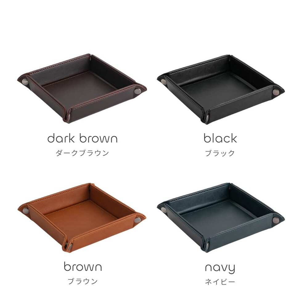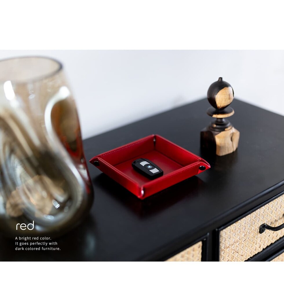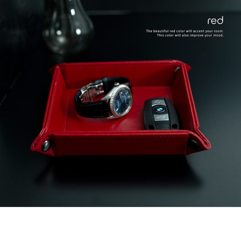 鍵やアクセサリー、小型のデジタル機器など、散らばりがちな貴重品の整頓にぴったりなレザー調トレイ。