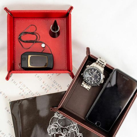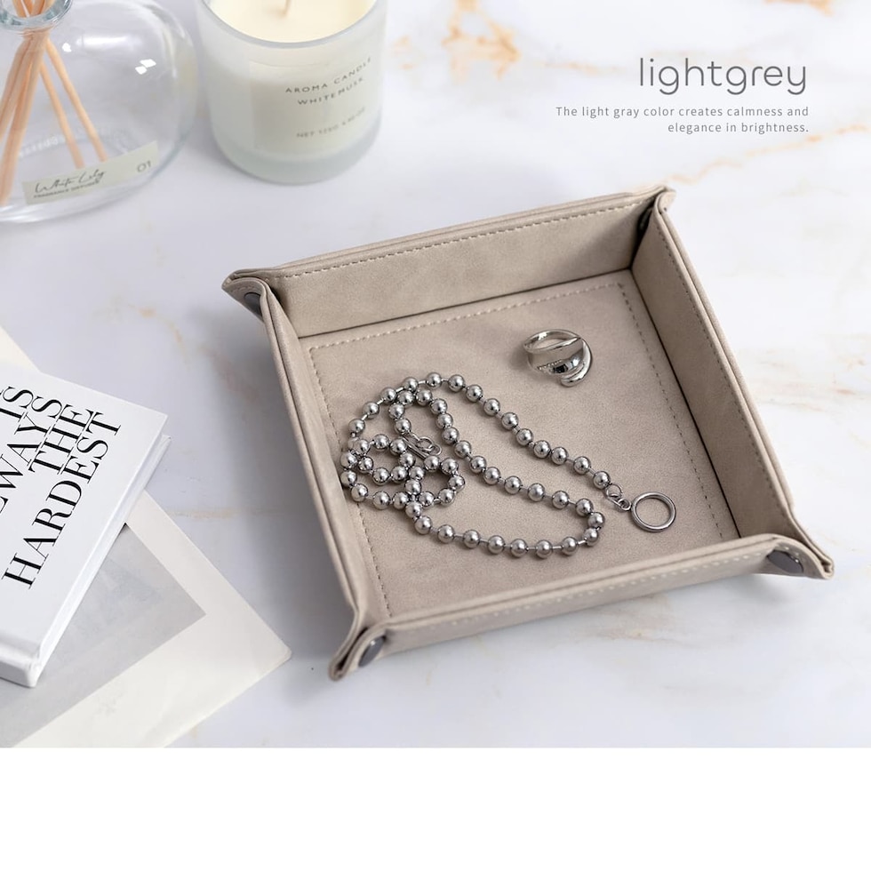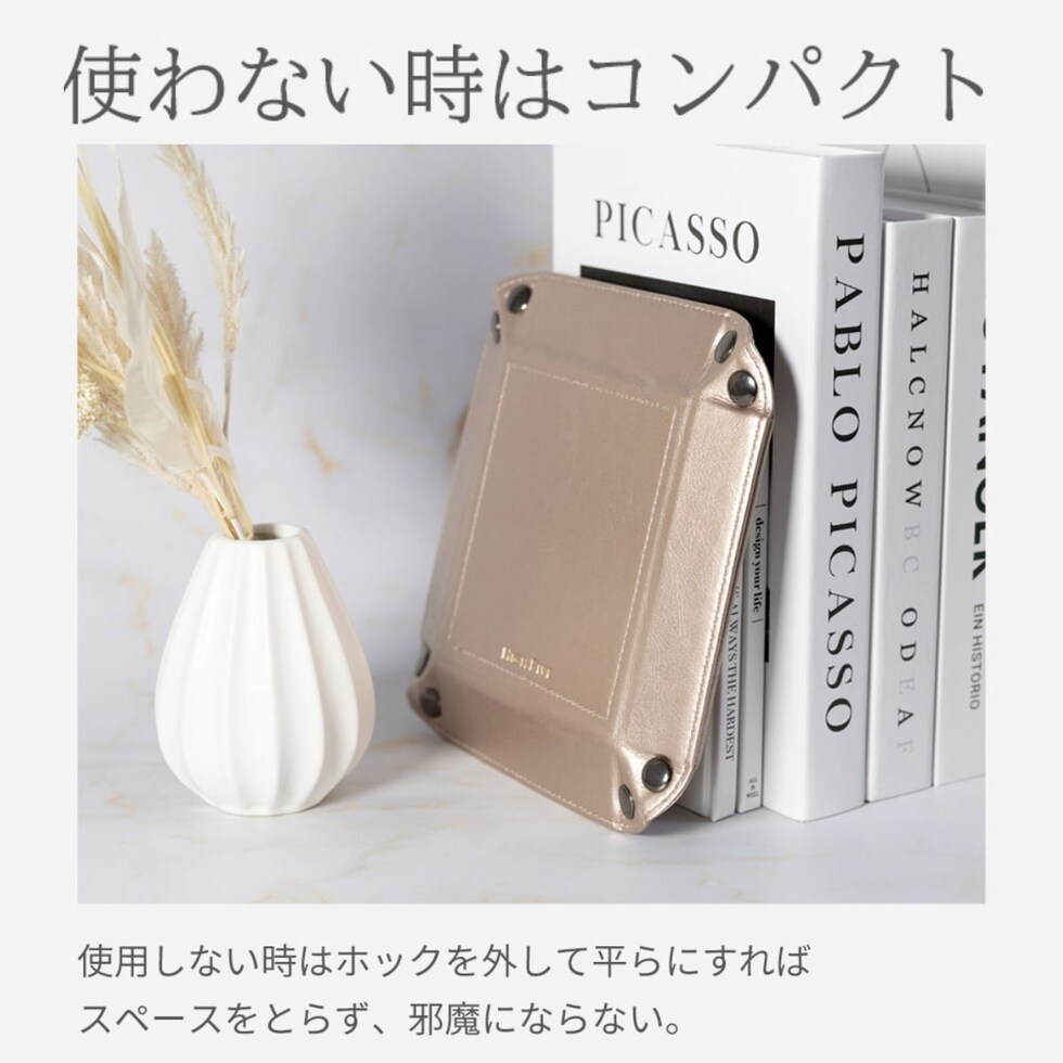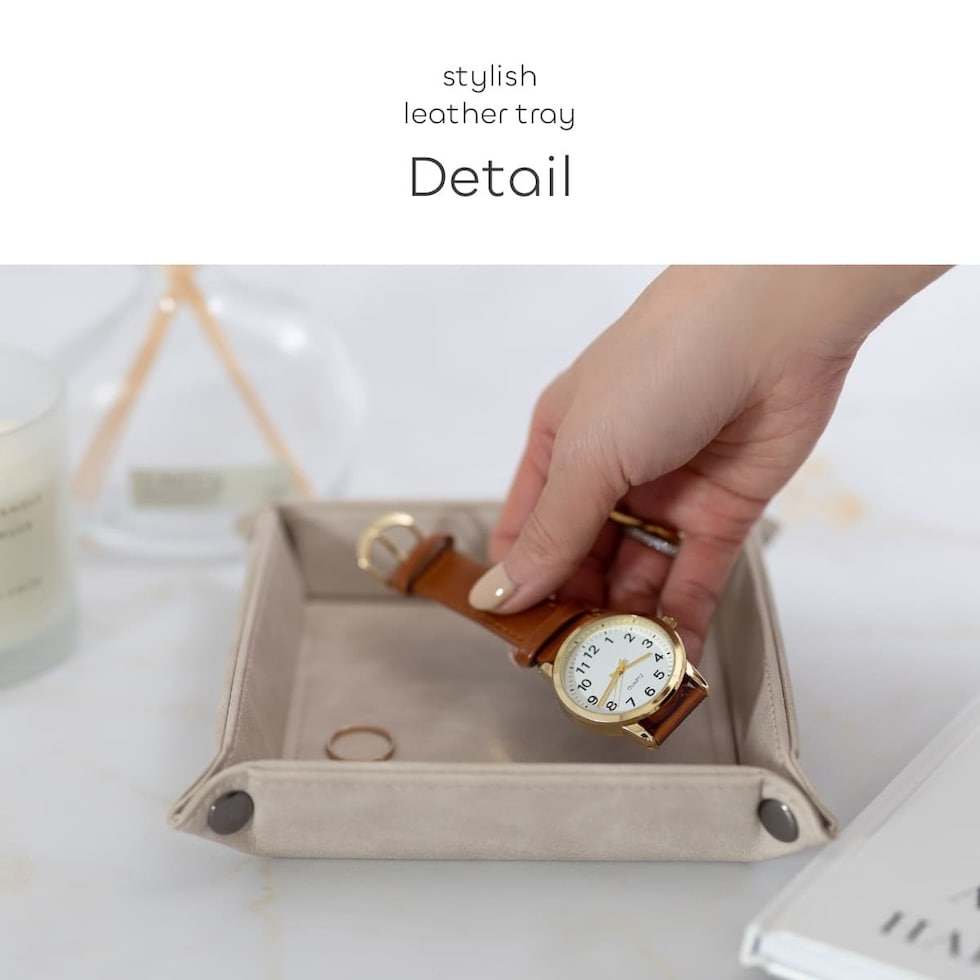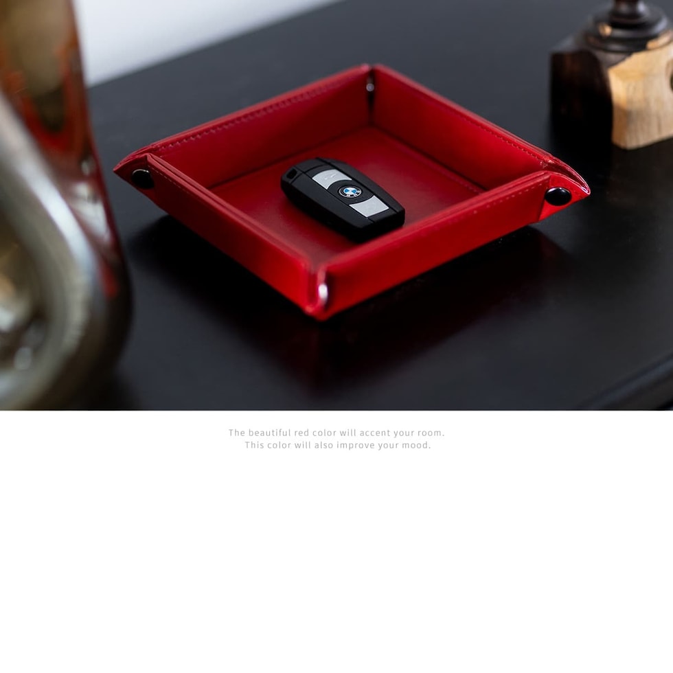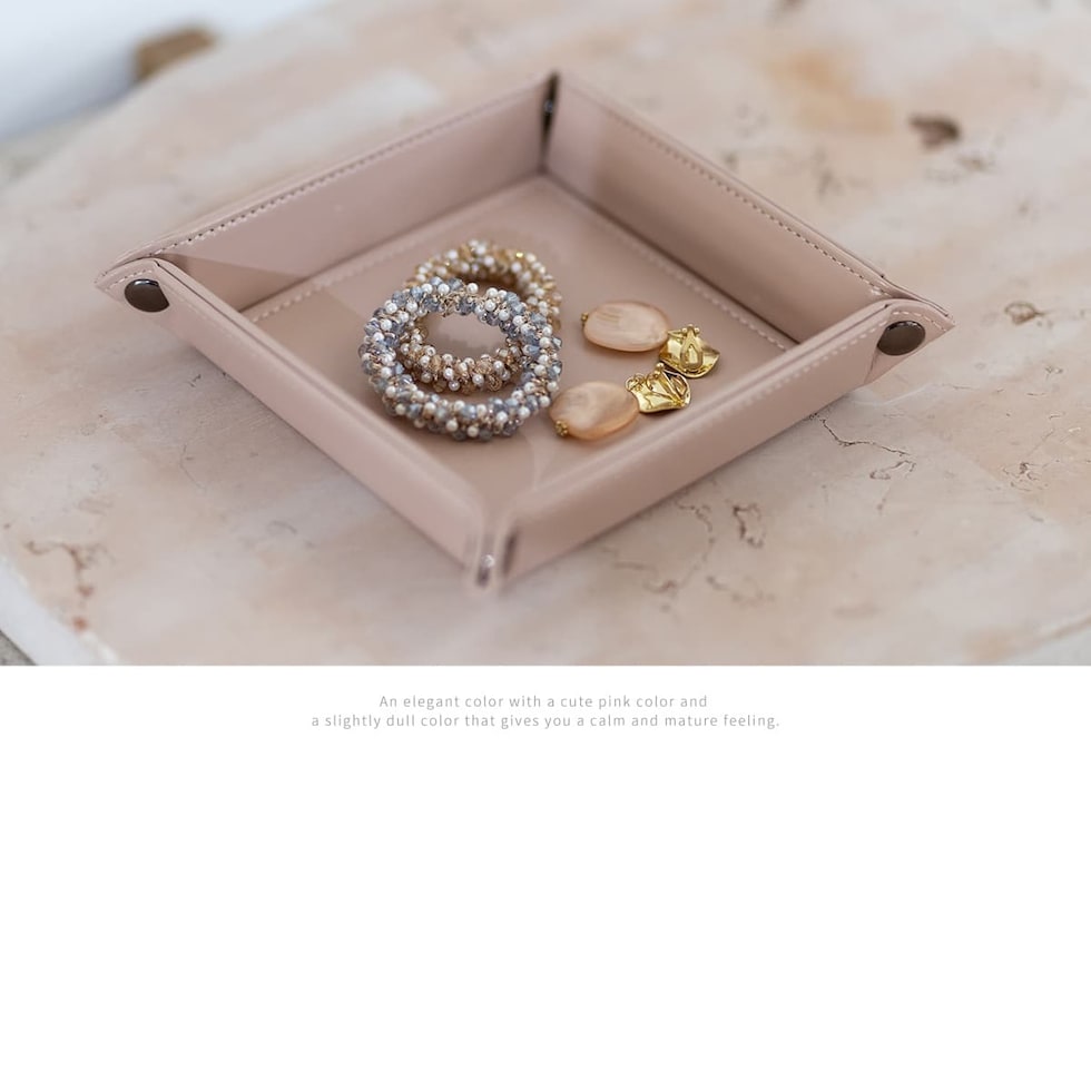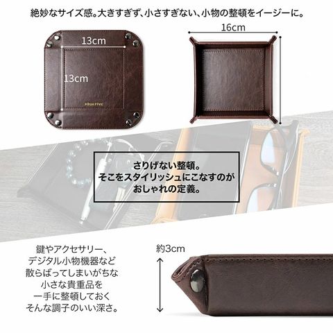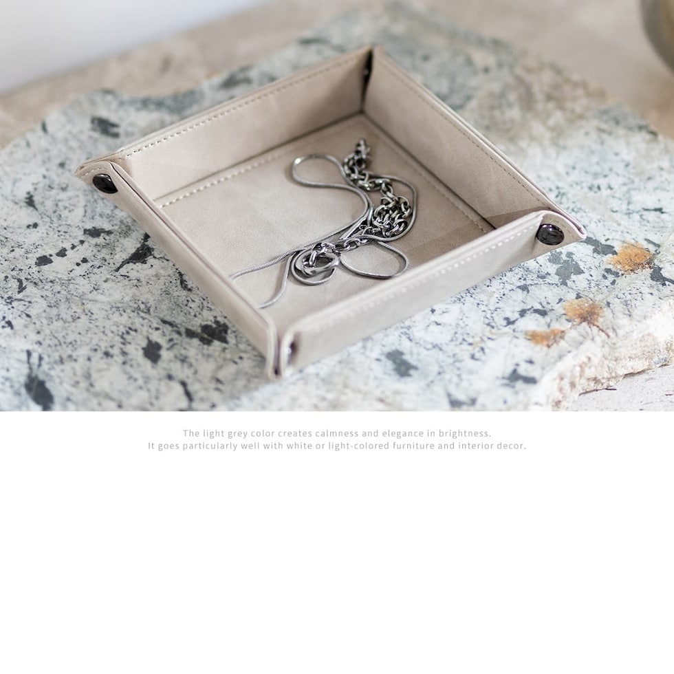 鍵やアクセサリー、小型のデジタル機器など、散らばりがちな貴重品の整頓にぴったりなレザー調トレイ。