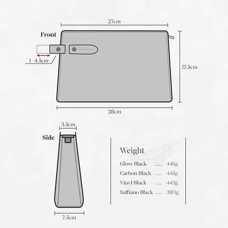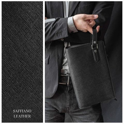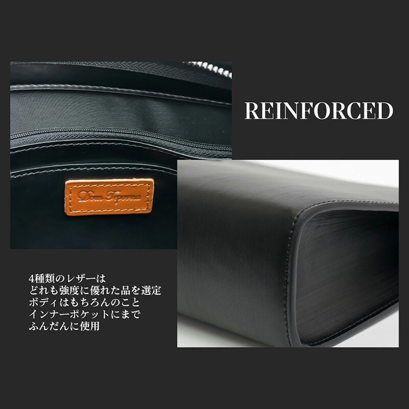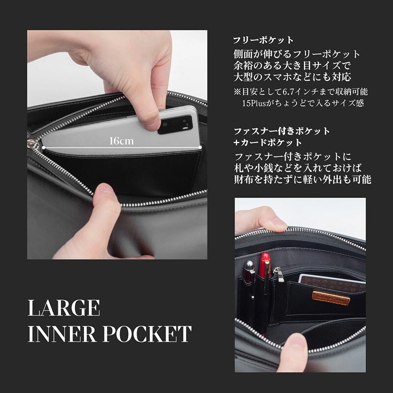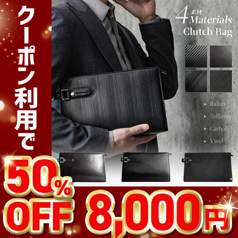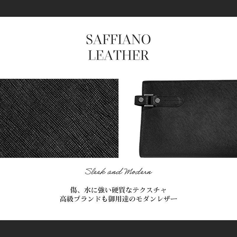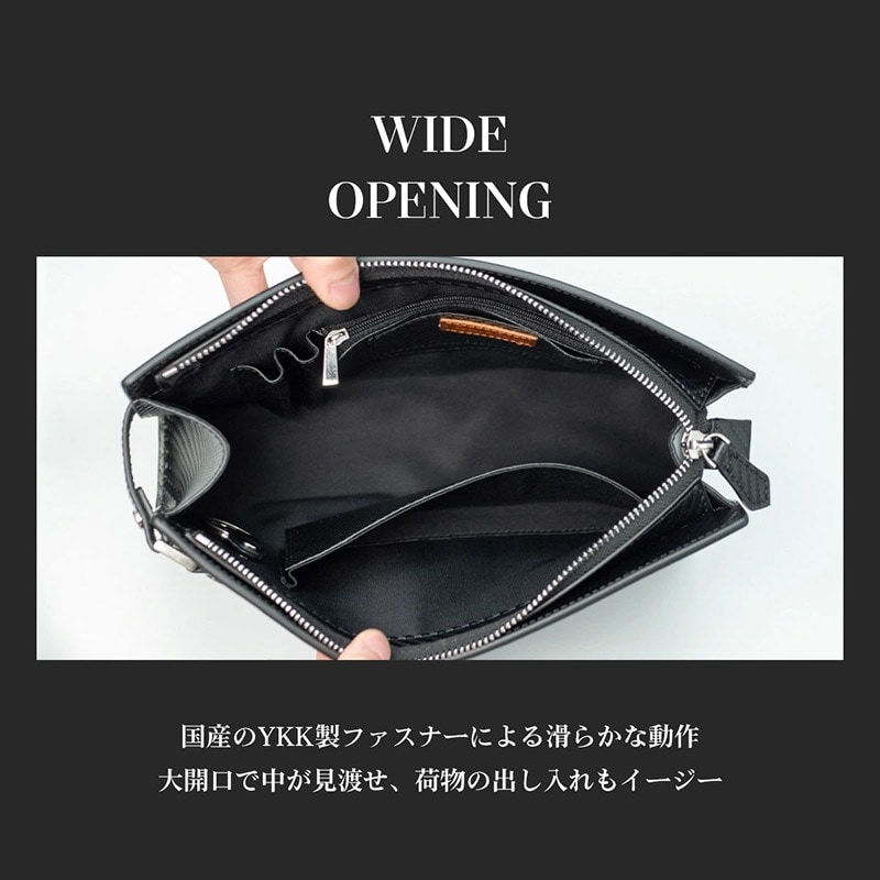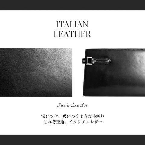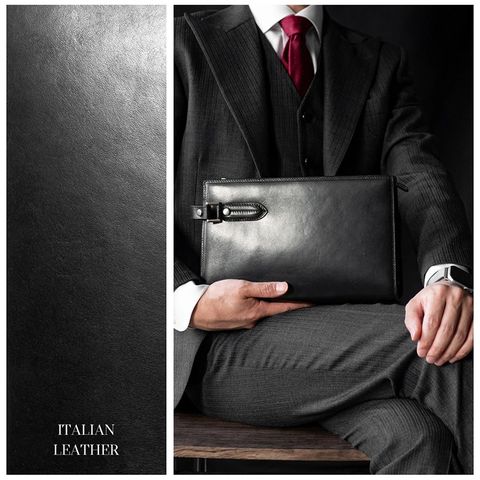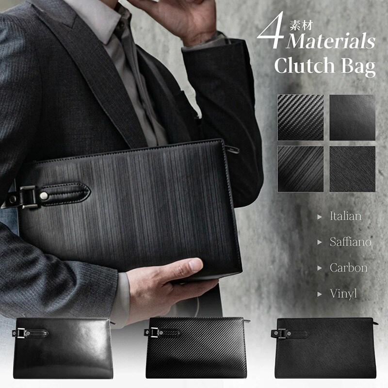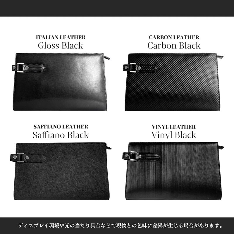 イタリアンレザー(gloss)・バイナルレザー・サフィアーノレザー・カーボンレザー。魅力的な4タイプの牛革をそれぞれ用いて、職人が丁寧に作り上げたセカンドバッグです。手に馴染むサイズと重厚感は、普段遣いはもちろんフォーマルな場面にも映えます。