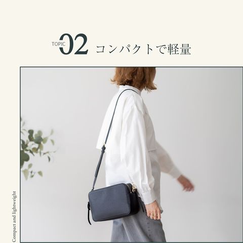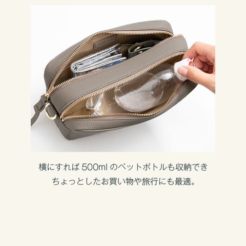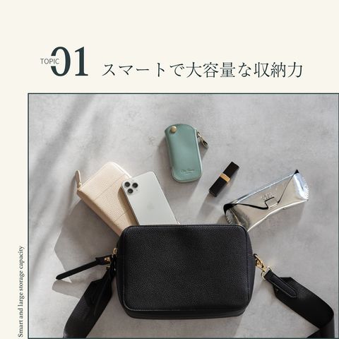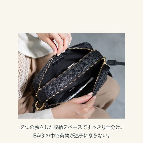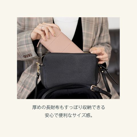 見た目はコンパクトながら長財布+αが余裕で収まる大容量。独立した2ルーム仕様で、増えがちな荷物も自然と整理整頓。