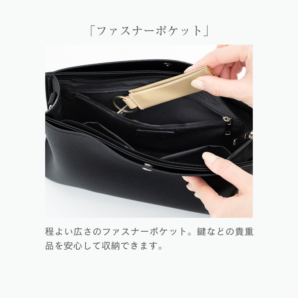メイン収納は長財布もすっと入る大容量で、ファスナー付きだから安心。