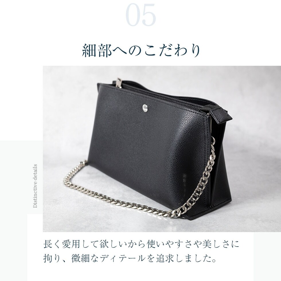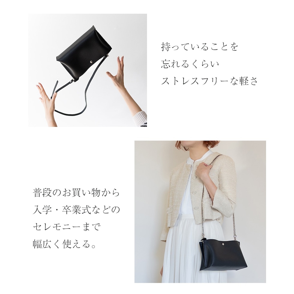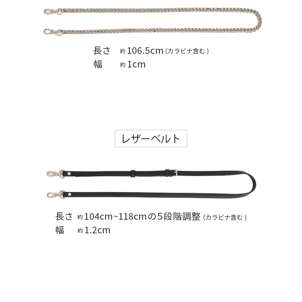簡単に付け替え可能なタイプの違う2種類のストラップ付き。5段階でサイズ調節可能な上品なレザータイプと、華やかなチェーンタイプを気分によって楽しめます。