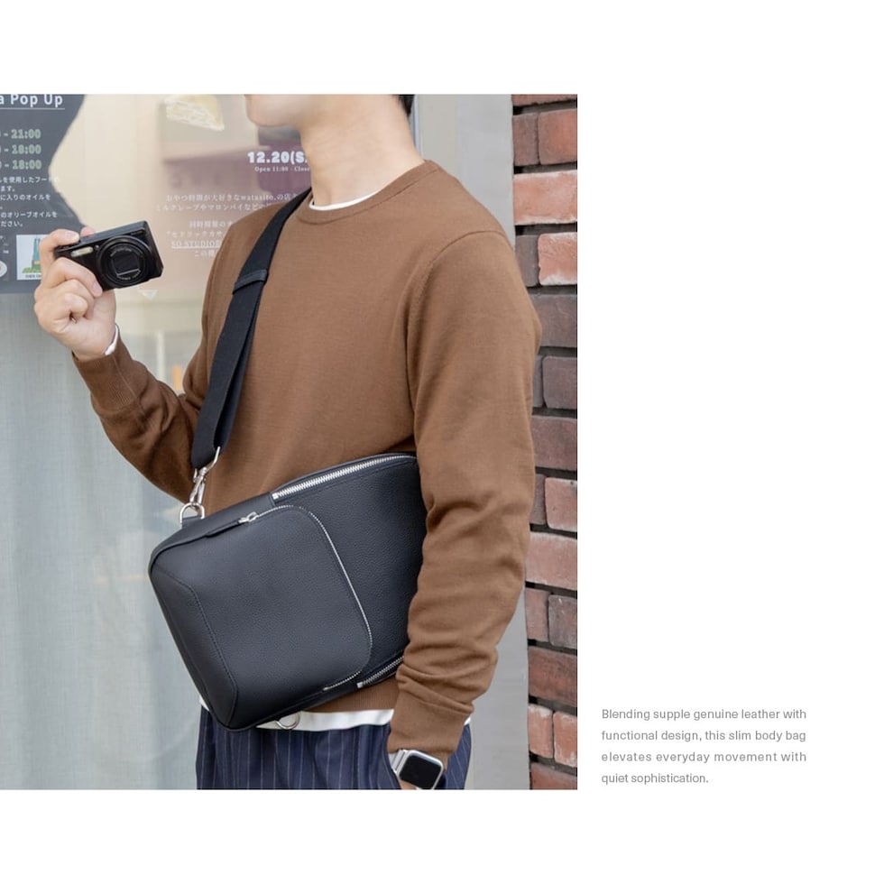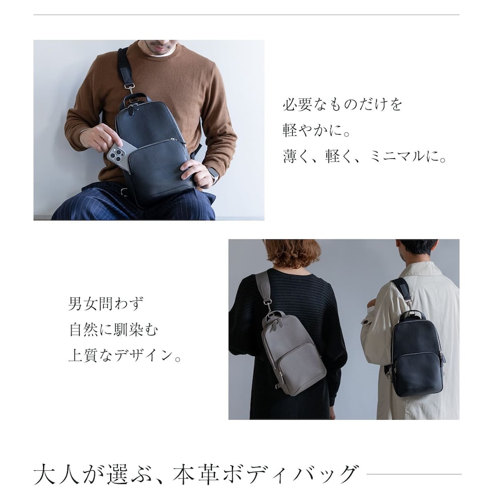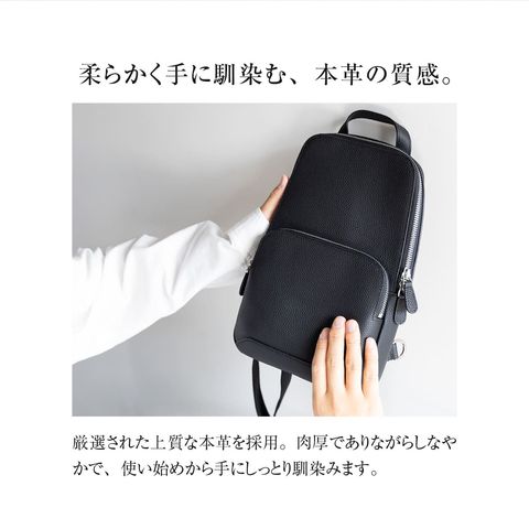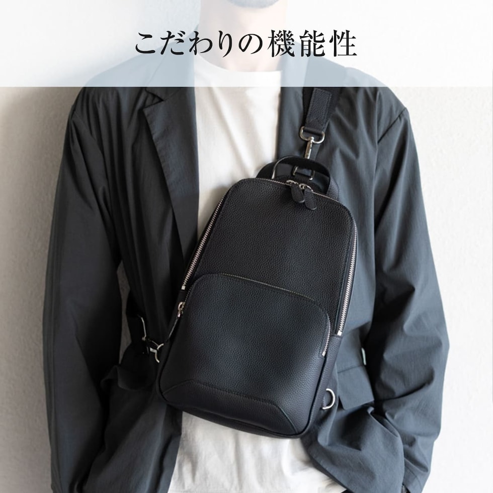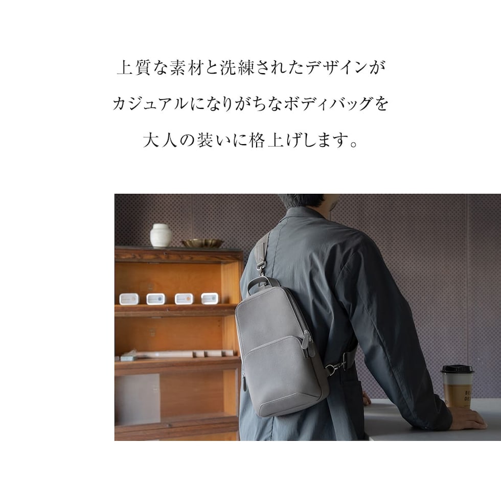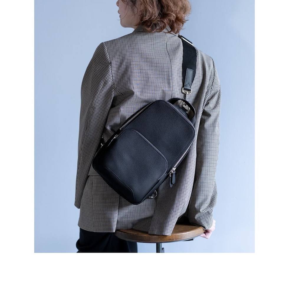 細やかなシボ感の上質レザーで仕上げた、大人のためのボディバッグです。ストラップで肩掛け、斜め掛けに。ハンドルでさらっと手持ちスタイルにも。洗練されたデザインが、カジュアルになりがちなボディバッグを上品な装いに格上げします。
