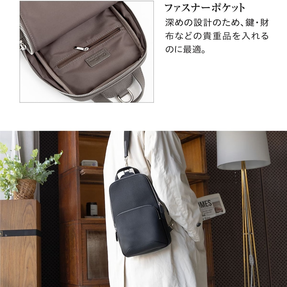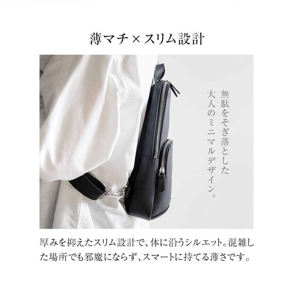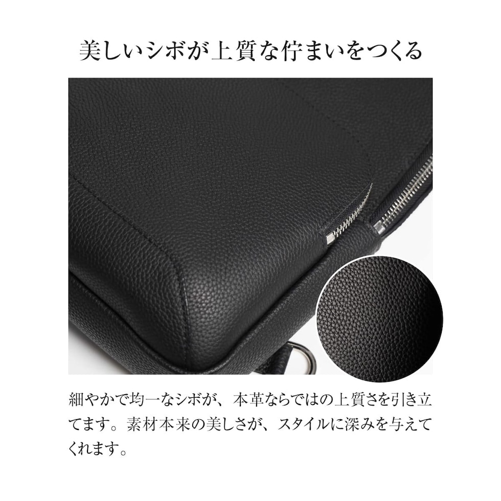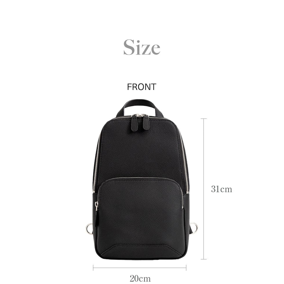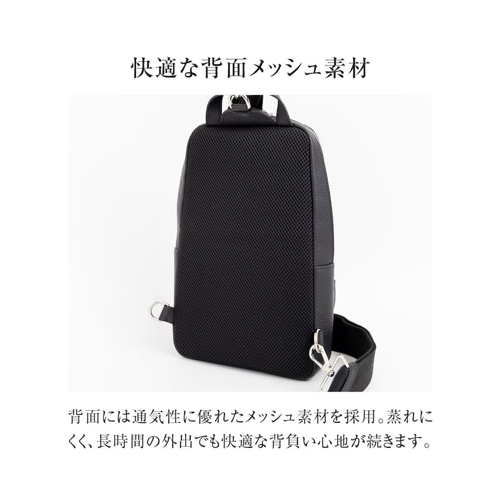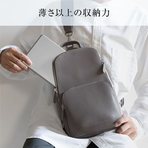 細やかなシボ感の上質レザーで仕上げた、大人のためのボディバッグです。ストラップで肩掛け、斜め掛けに。ハンドルでさらっと手持ちスタイルにも。洗練されたデザインが、カジュアルになりがちなボディバッグを上品な装いに格上げします。