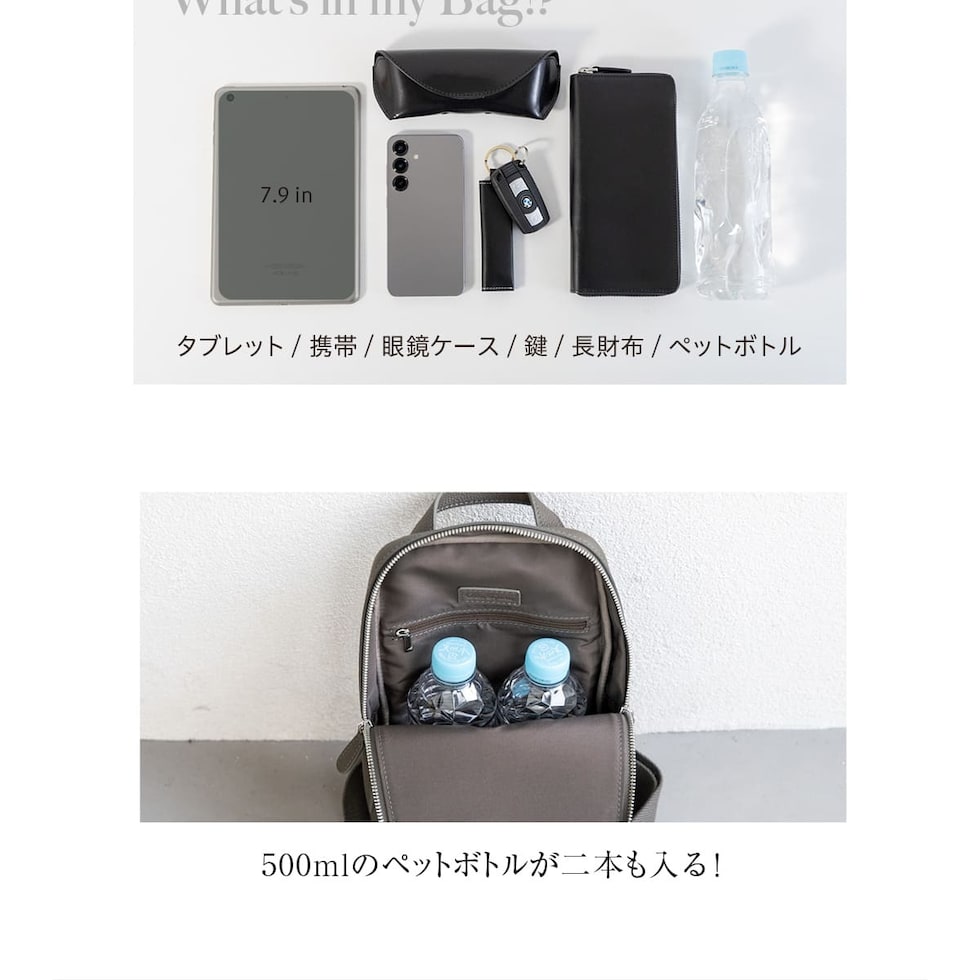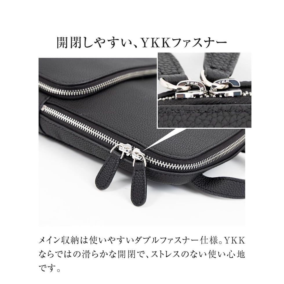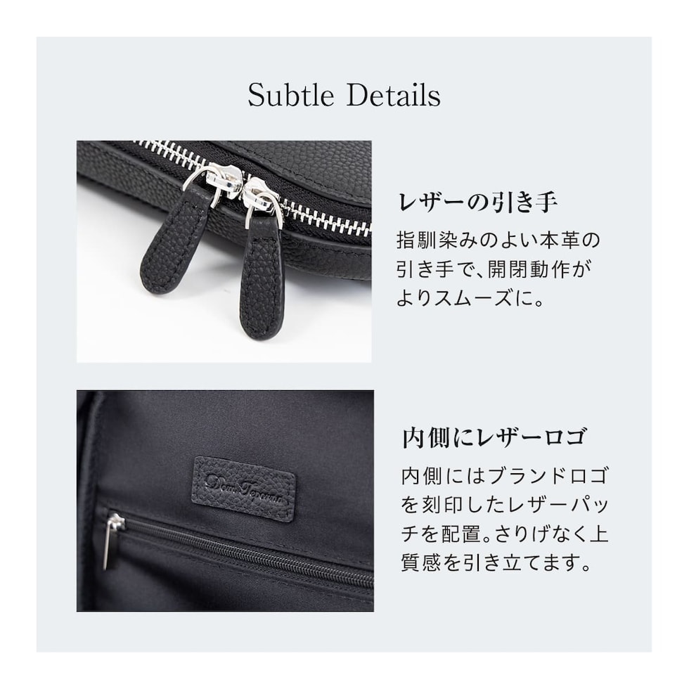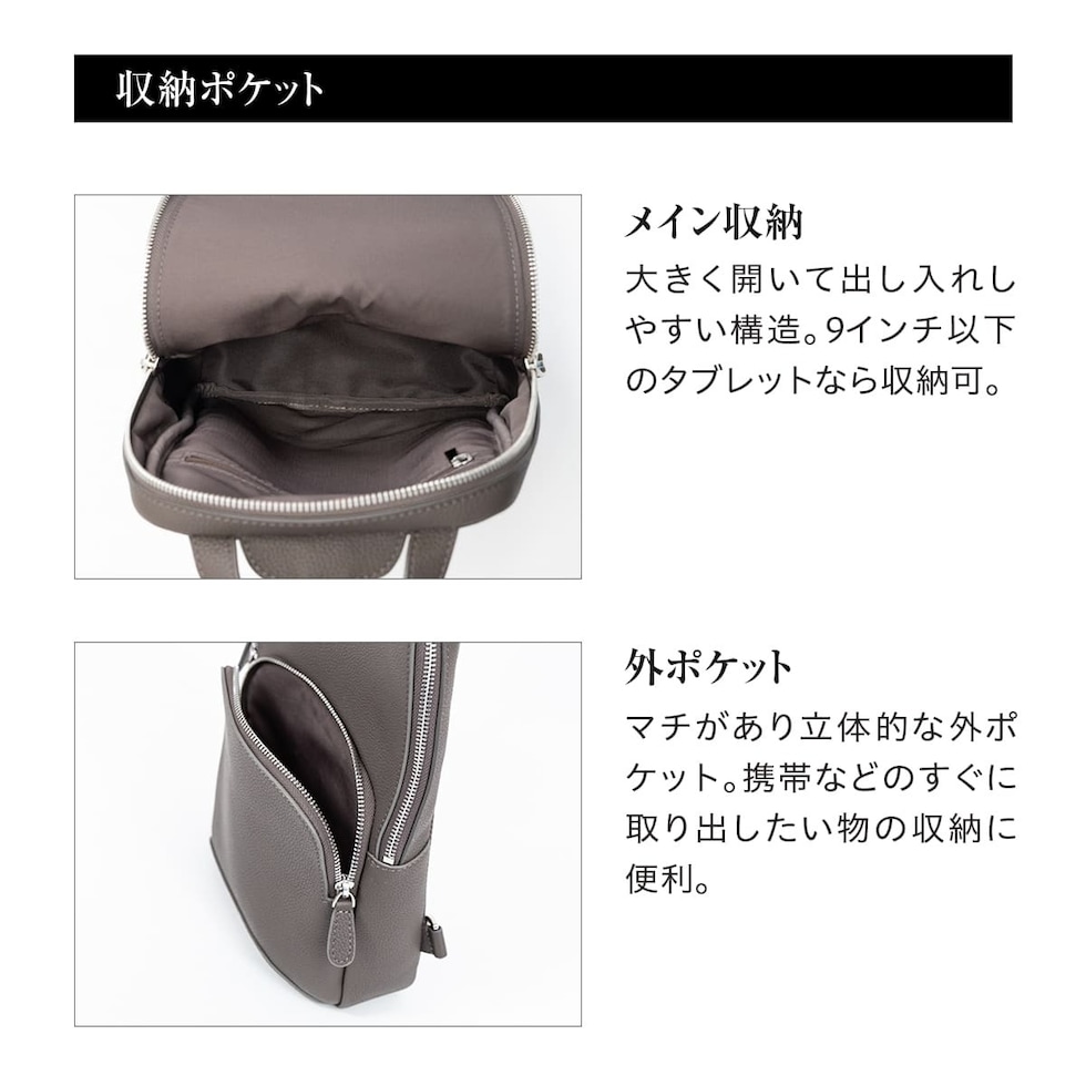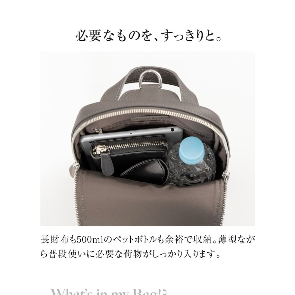 メイン収納に、立体形状が美しい外ポケット。メイン収納内部にはファスナーポケットもお付けしました。必要なものを迷わず取り出せる無駄のない構造と、収納力は十分ながら厚みを抑えたスリム設計は、日常使いに最適です。