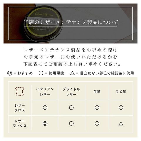 革の種類によりシミや色落ちする素材もございます。全体にご使用いただく前に、目立たない部分でテストしてください。