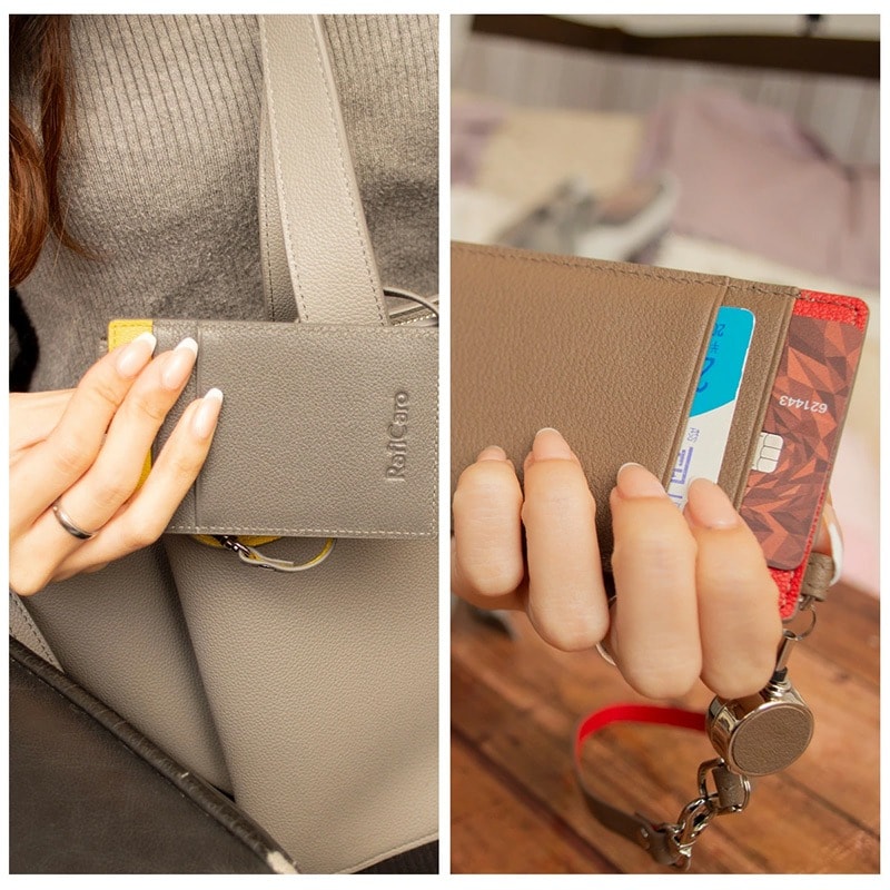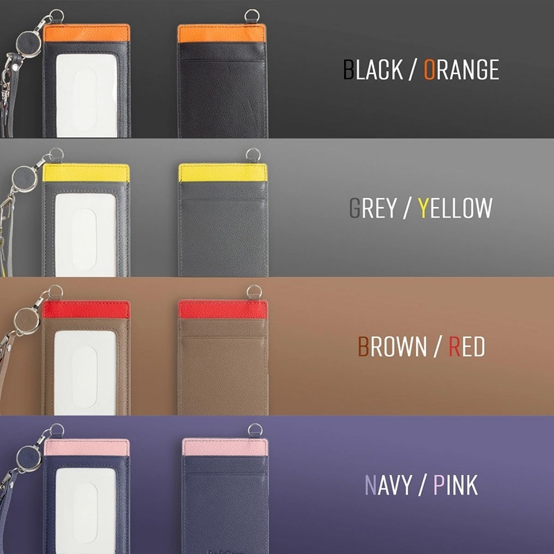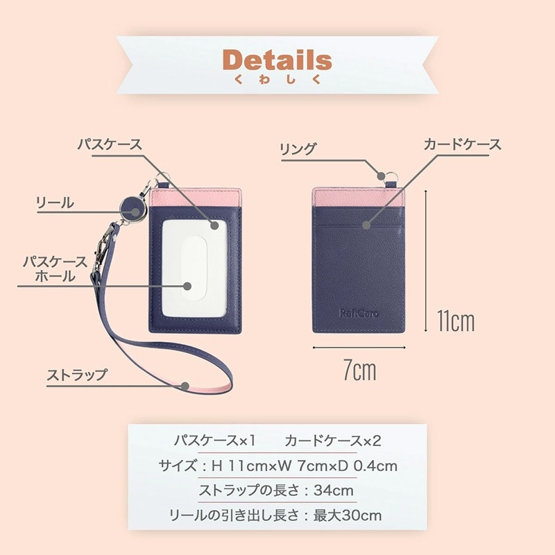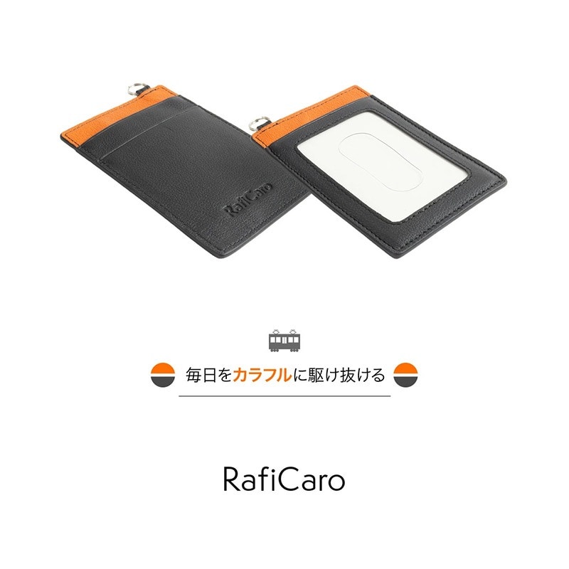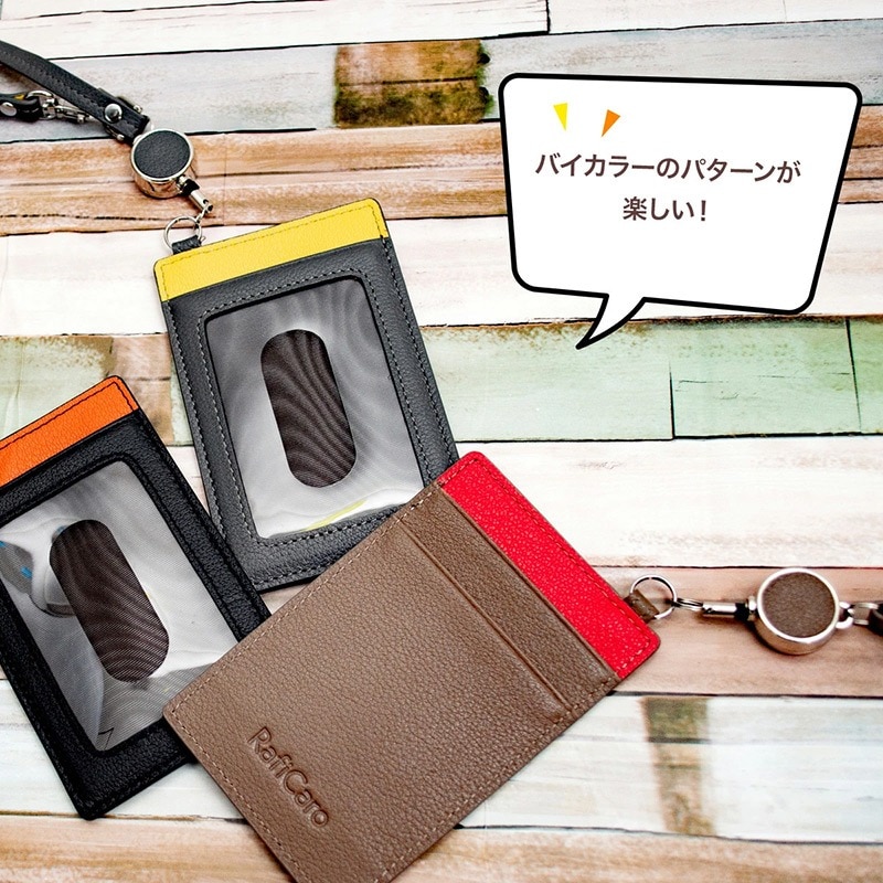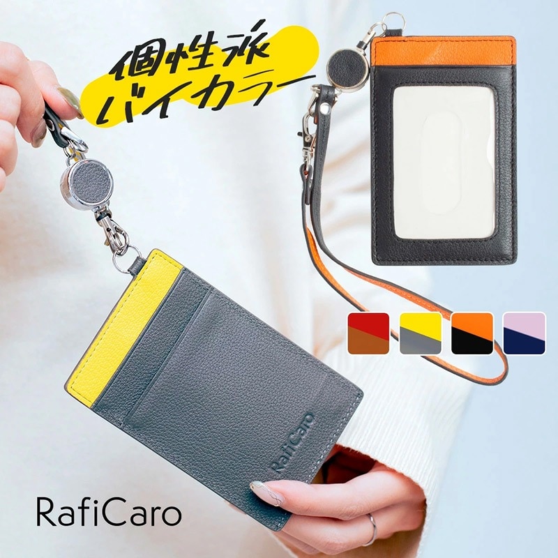 RafiCaro リールストラップ付きパスケース 牛革 ポケット3つ 定期入れ greyyellow/グレー×イエロー
