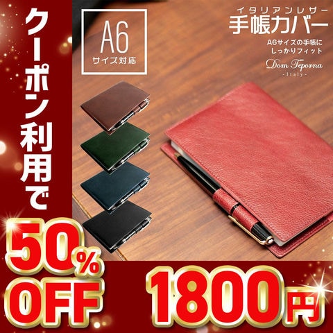 【50%OFFクーポン1,800円!】Dom Teporna Italy 手帳カバー A6サイズ 厚さ調整可能 ペンホルダー付き 本革 red/レッド