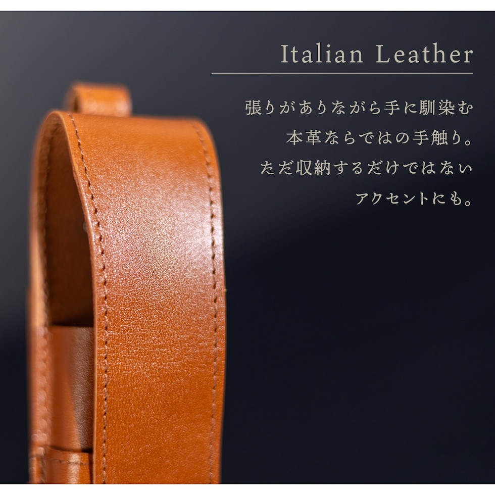 伝統的な製法で仕上げたイタリアンレザーを使用しています。あえて裏張りをせず本革の質感を活かし、ステッチも同系色で丁寧に。使い続けることで深まる色合いと手触りをお楽しみいただけます。人気ブランドならではのこだわりがつまったアイテムです。