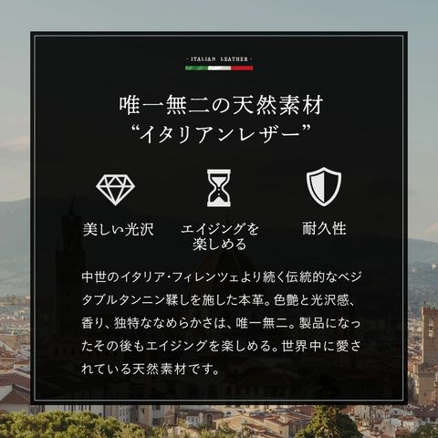 日本では栃木レザーがブランドレザーとして有名ですが、イタリアンレザーはブライドルレザーやコードバンと同様に世界三大高級レザーの一つとして愛されているイタリアの伝統的な製法です。