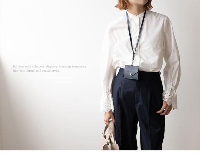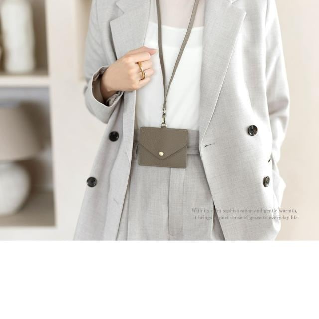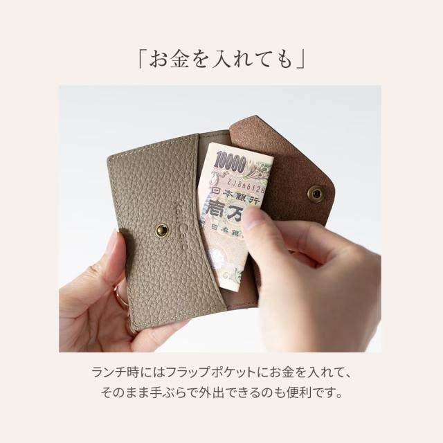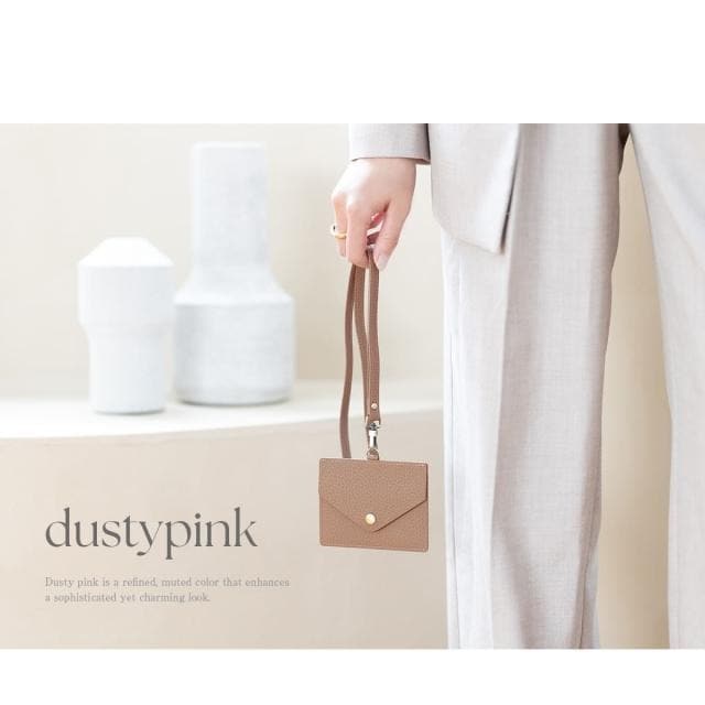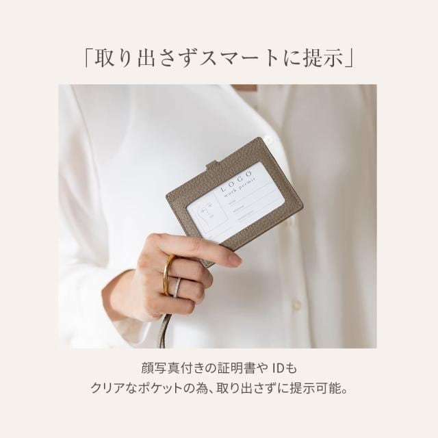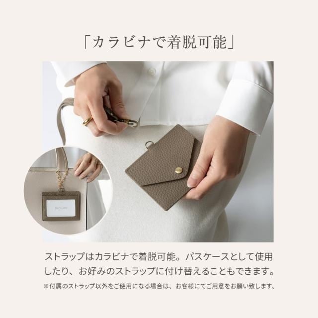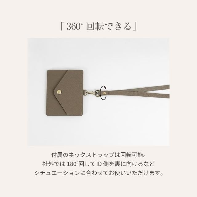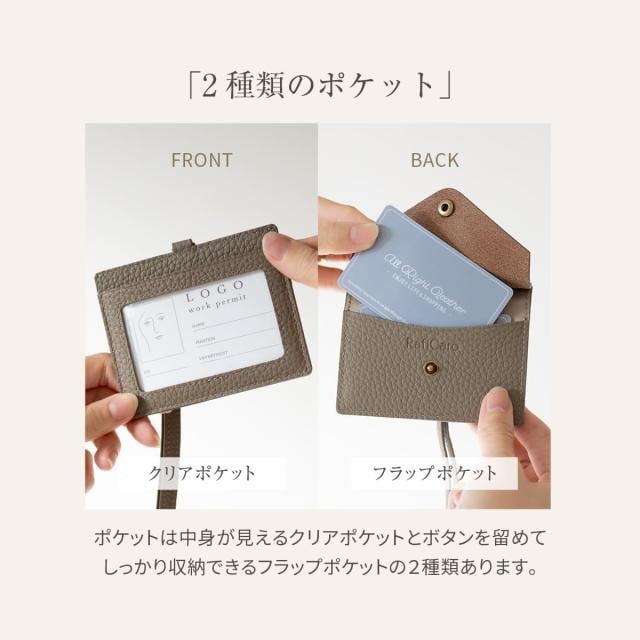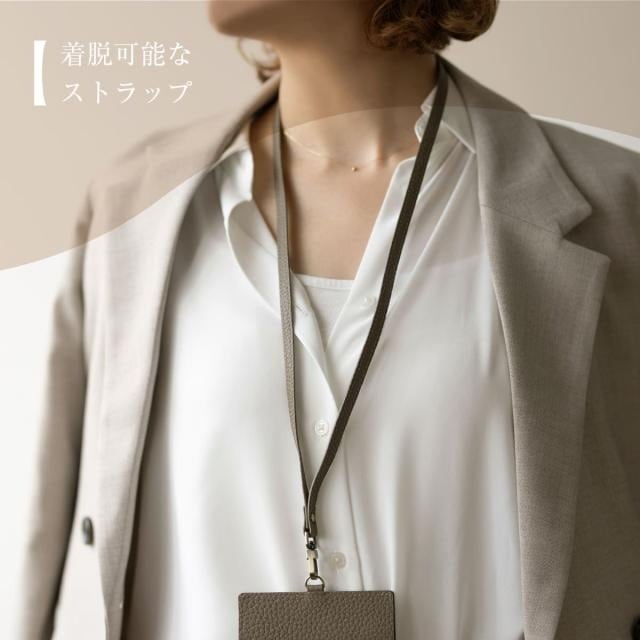 片面はクリアポケット、くるっと回すとボタン留めのフラップポケット。シチュエーションに応じて使い分けできるカードホルダーです。ネックストラップは取り外し可能で、パスケースとして使用したりお好みのストラップへの付け替えもおすすめです。