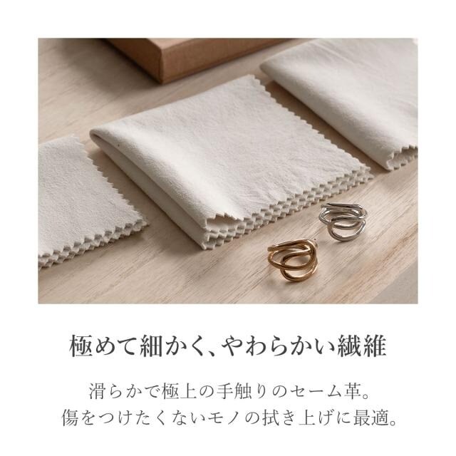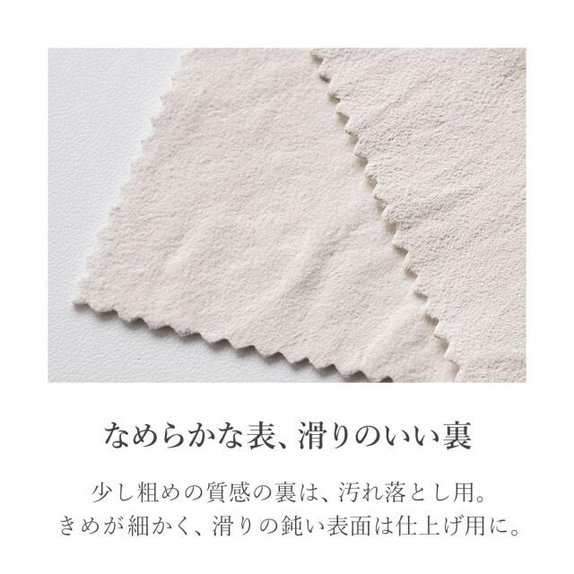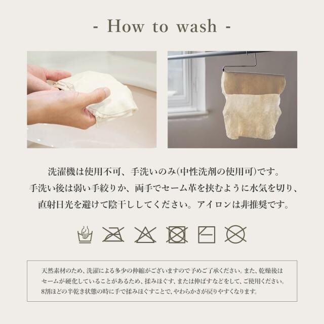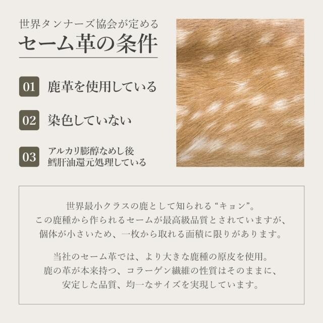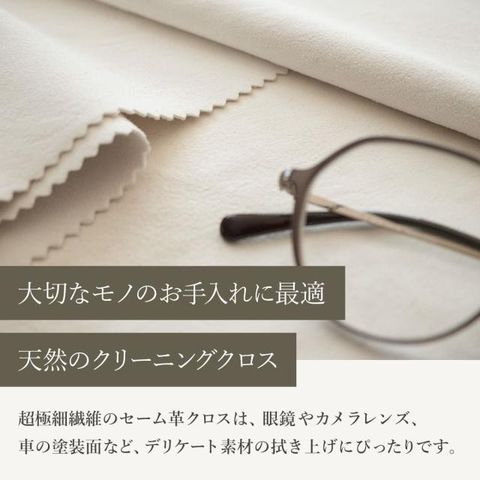 革の中でも特に柔らかな鹿革は、メガネやアクセサリー、楽器やカメラ機材などのお手入れに最適。極細のコラーゲン繊維で拭き傷の心配が少なく、汚れを優しく絡め取ります。アルカリ膨醇鞣しと鱈肝油還元処を施した本格派セーム革の使い心地をお楽しみください。
