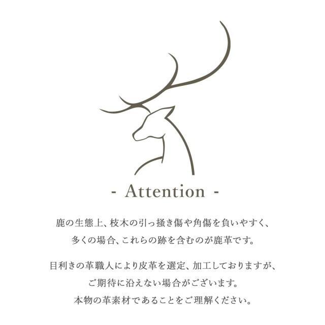 ※鹿は生態上、枝木の引っ掻き傷や角傷を負いやすく、鹿革にもそれらの痕が残ります。本製品にも傷や皺の痕、革の部位による若干の厚みの差がみられることがあります。本物の革の証としてご了承くださいませ。