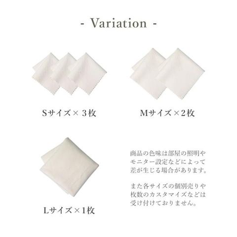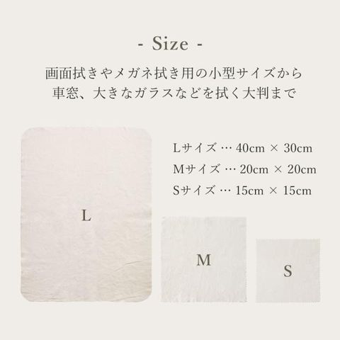車の拭き上げにも使える大判Lサイズ(1枚入り)。PCやタブレットにちょうどいいMサイズ(2枚セット)。持ち歩きに便利なSサイズ(3枚セット)。ギフトボックスに入れてお届けします。