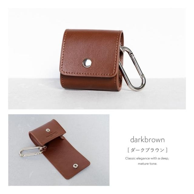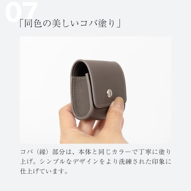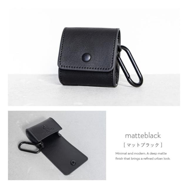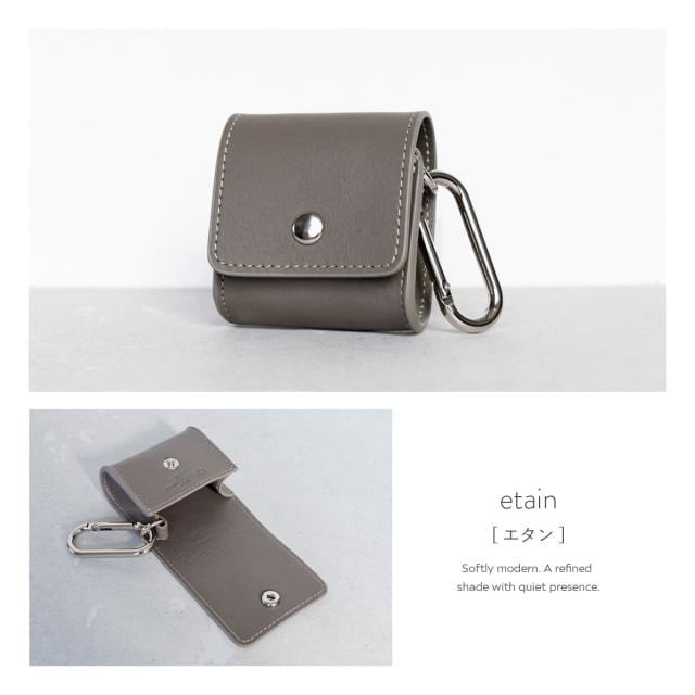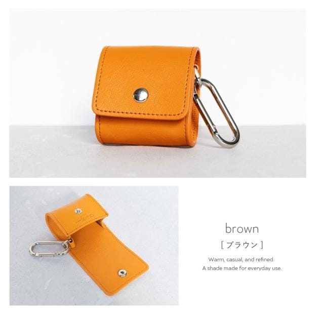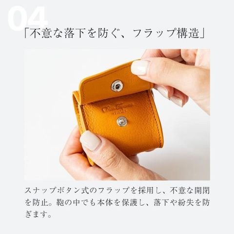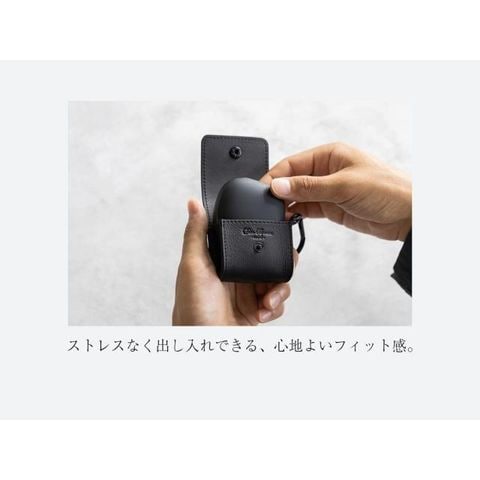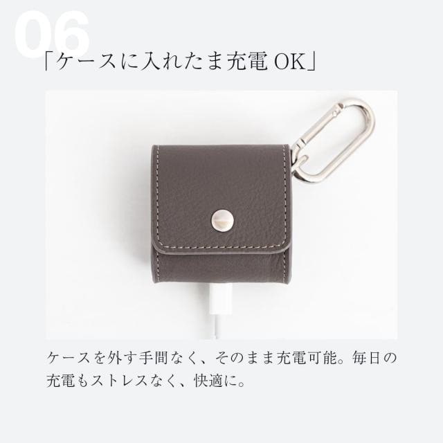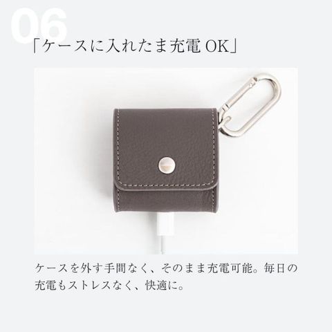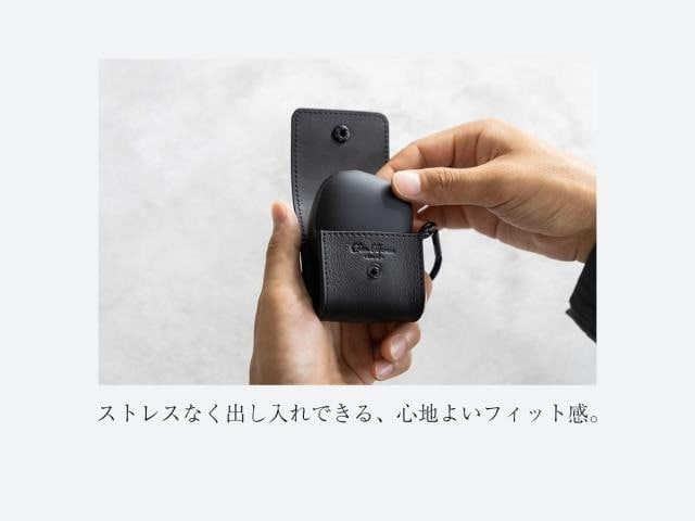 大切なイヤホンを傷から守る本革製カバーです。フラップはスナップボタン留めタイプなので、不意に開いてしまうこともありません。底面には充電用ホール付き。ケースに入れたまま充電可能です。