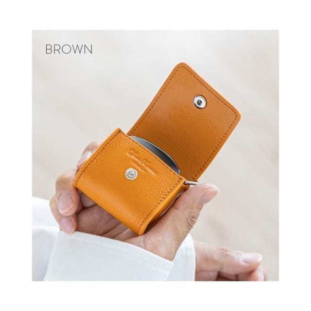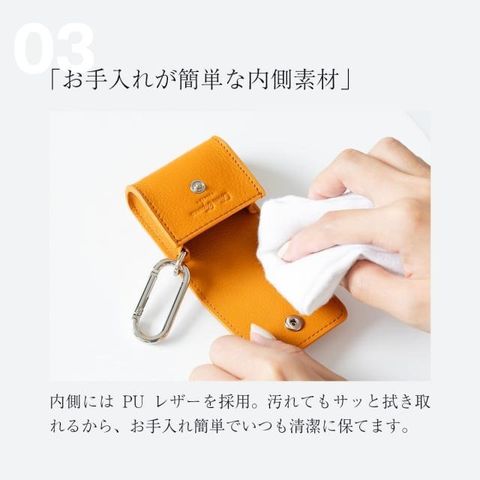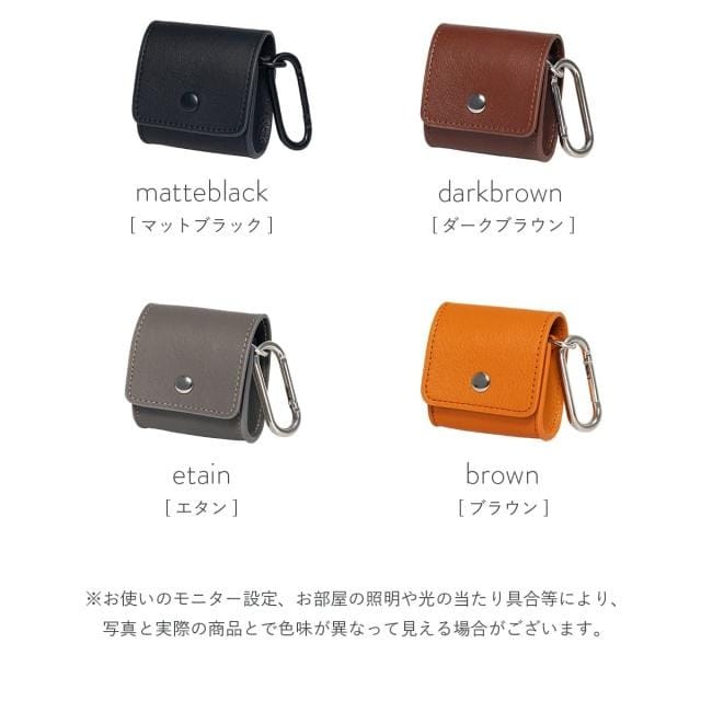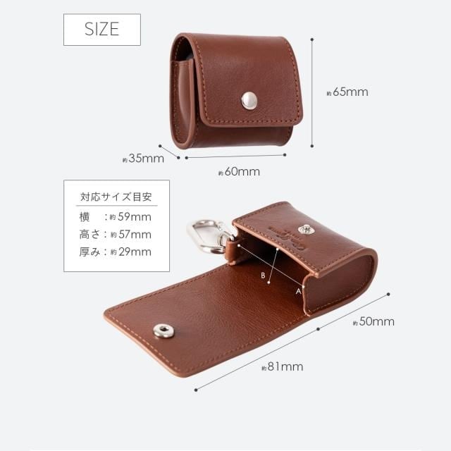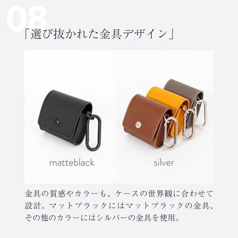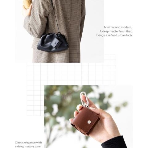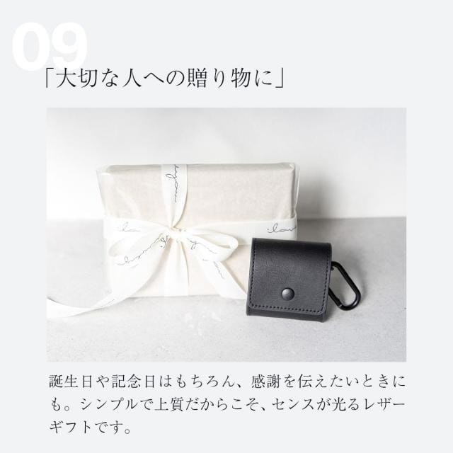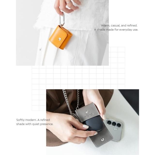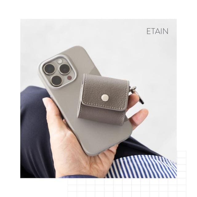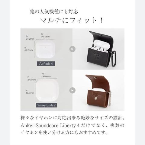 大切なイヤホンを傷から守る本革製カバーです。フラップはスナップボタン留めタイプなので、不意に開いてしまうこともありません。底面には充電用ホール付き。ケースに入れたまま充電可能です。