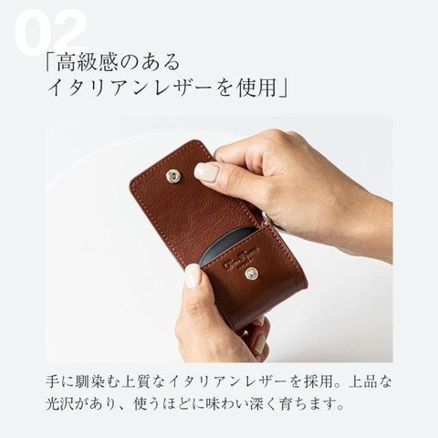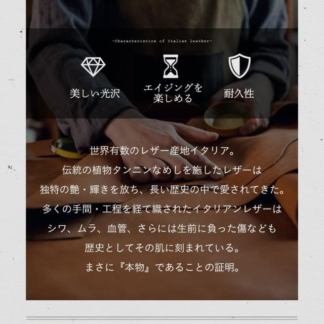 シンプルな形状だからこそ活きる上質なイタリアンレザー。伝統的な手法で鞣され、手ざわりと耐久性に優れています。金具やコバ処理もレザーに合わせたこだわり仕上げ。どんなスタイルにも馴染むアイテムです。