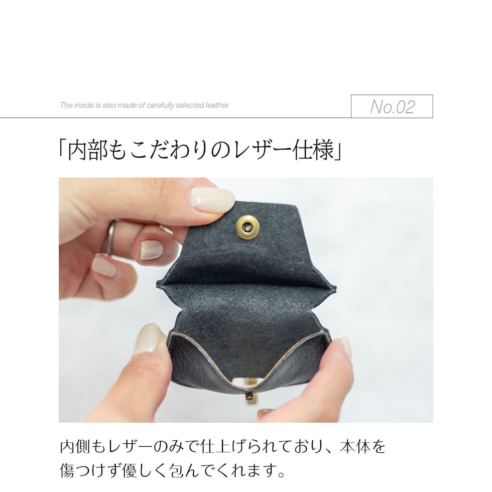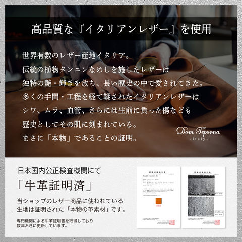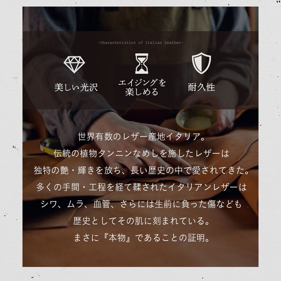 立体裁断されたイタリアンレザーは、本革ならではの上質な手触り。使うほどに形が馴染み、艶と色合いの深まるエイジングをお楽しみいただけます。カラビナにはレザーと相性の良いアンティークカラーの金具を採用しました。