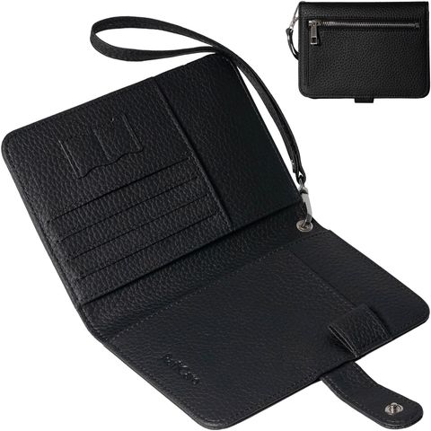 水気に強くお手入れ簡単なPUレザー+スキミング防止素材で中身をしっかり守ります。ハンドストラップ、ペンホルダー、マチ付きで大きく開くファスナーポケットなど、あったら嬉しい機能を詰め込みました。
