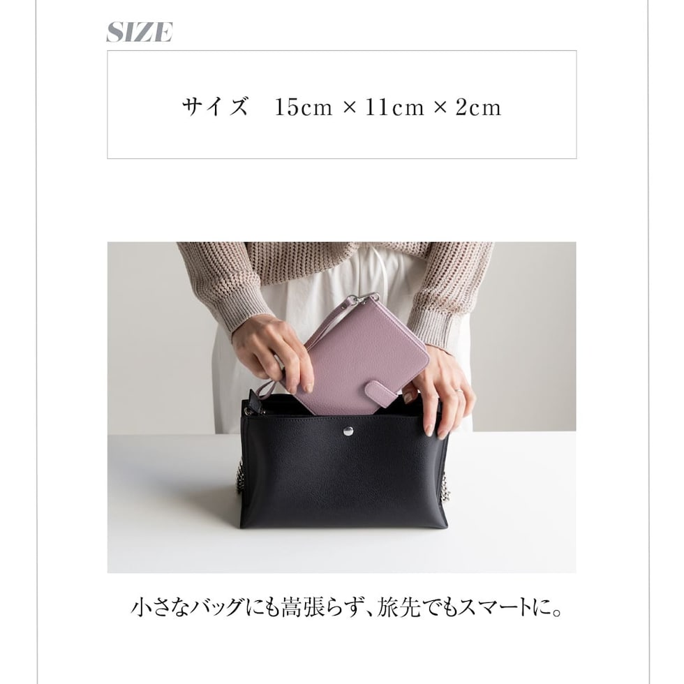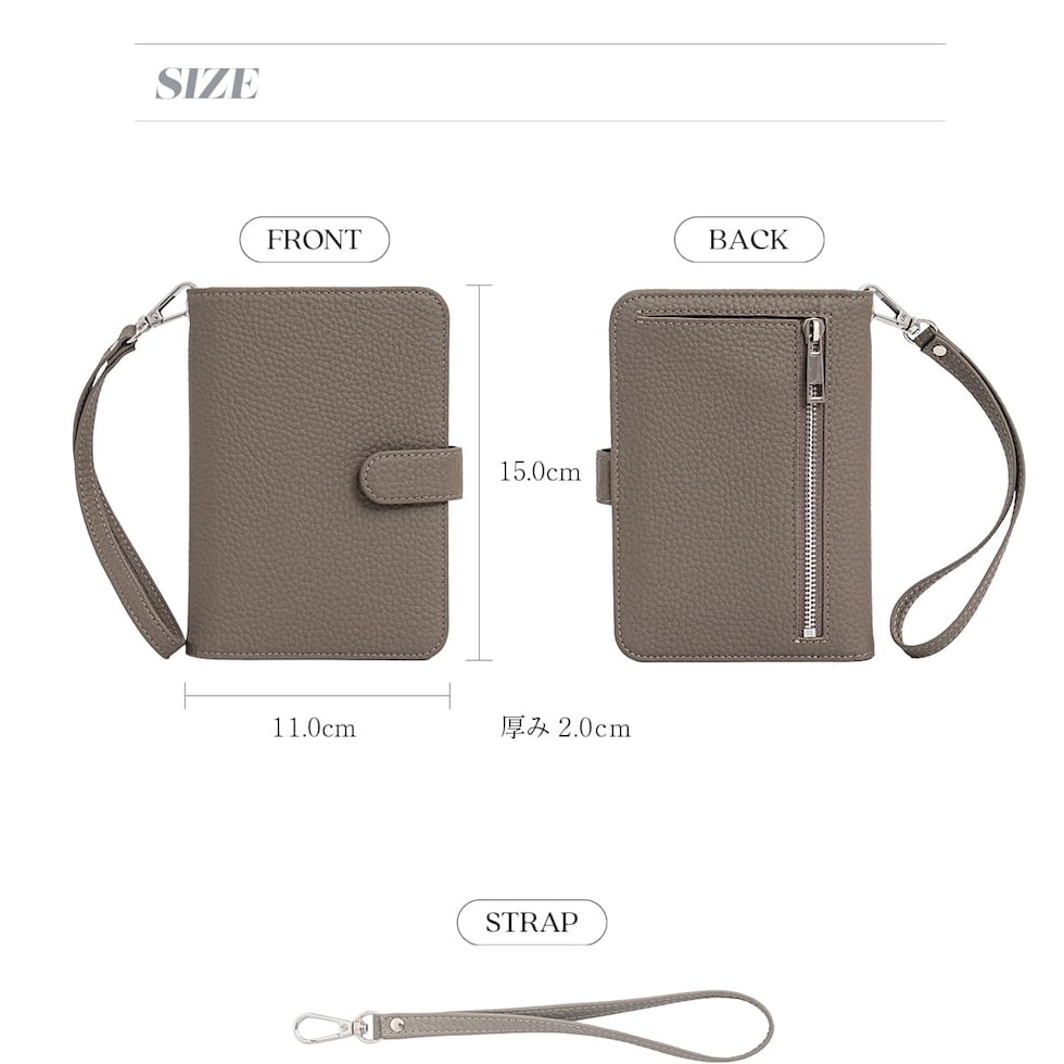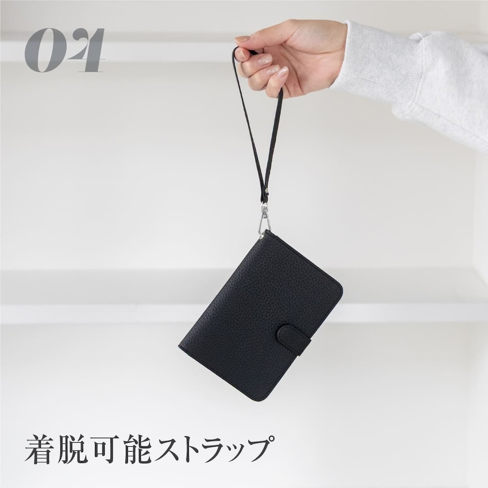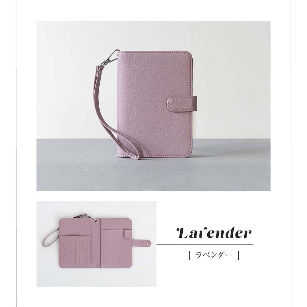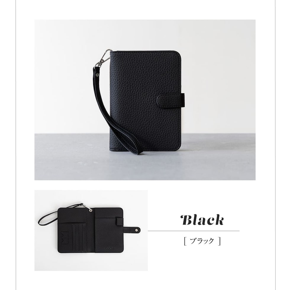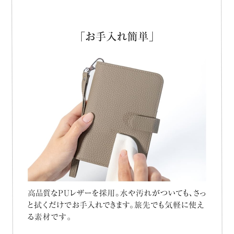 水気に強くお手入れ簡単なPUレザー+スキミング防止素材で中身をしっかり守ります。ハンドストラップ、ペンホルダー、マチ付きで大きく開くファスナーポケットなど、あったら嬉しい機能を詰め込みました。
