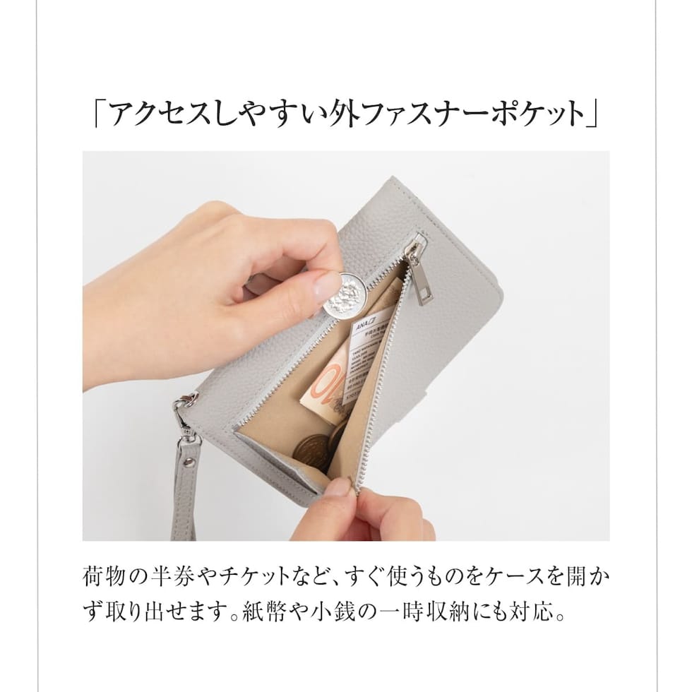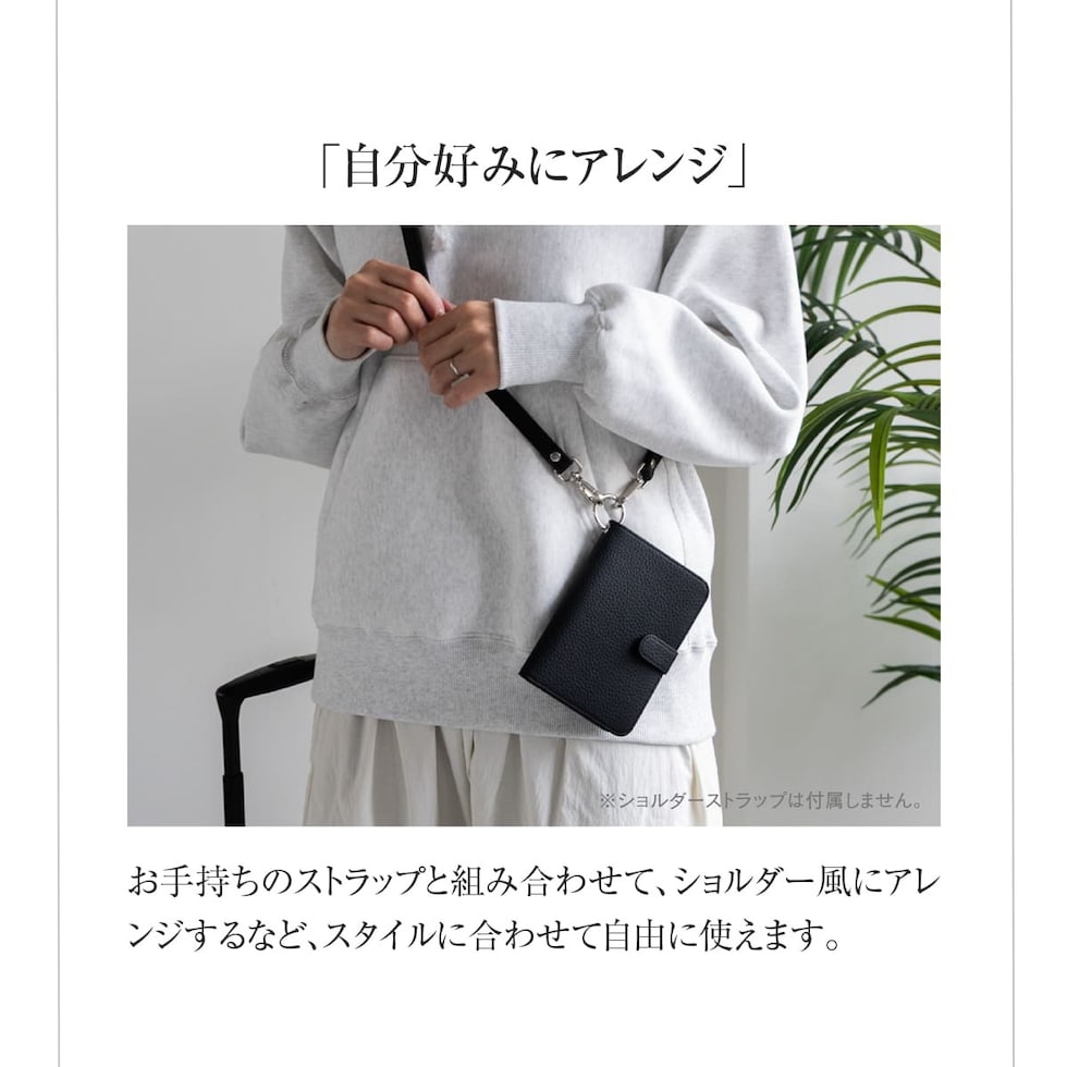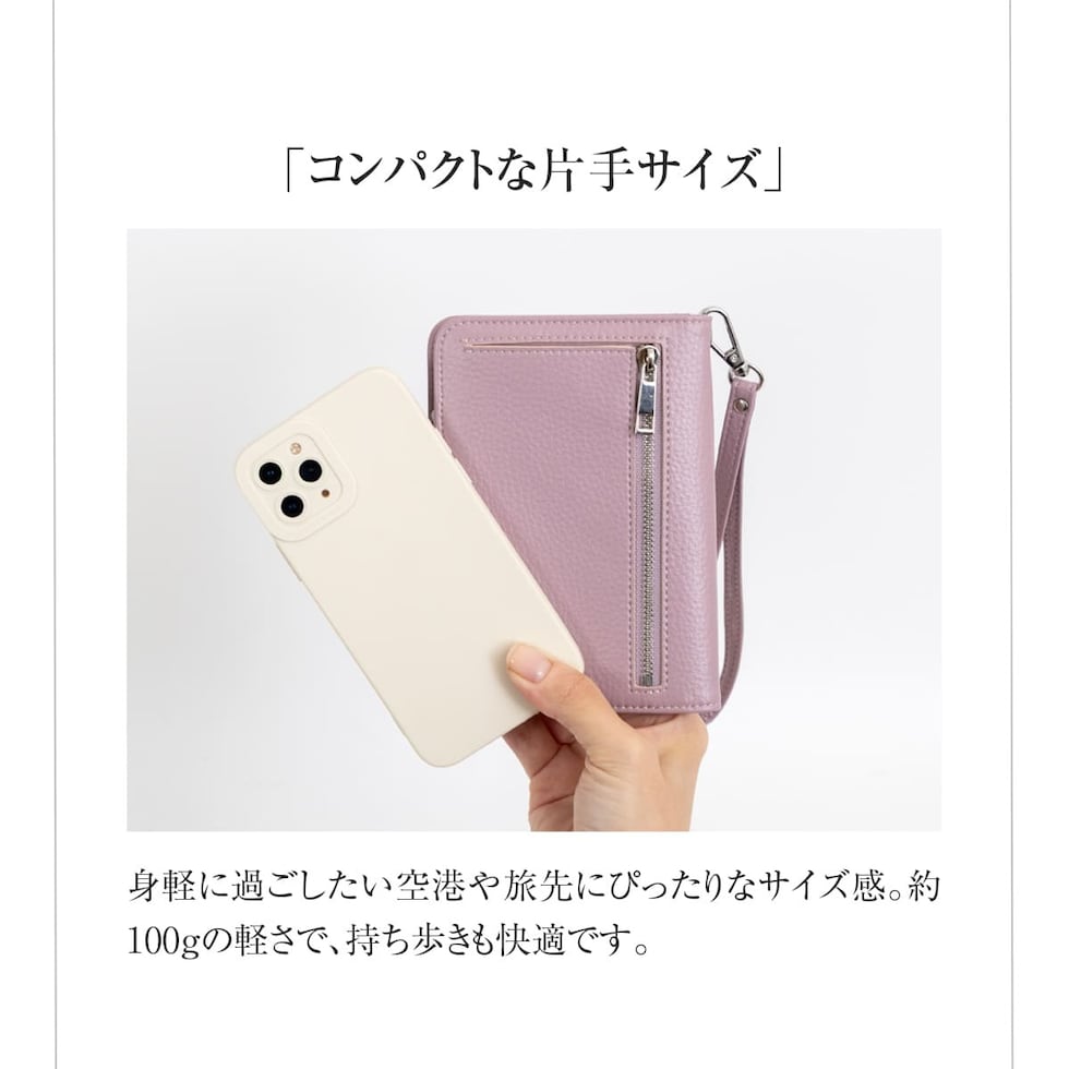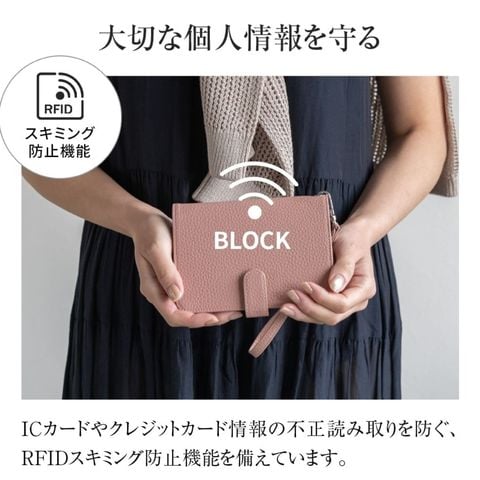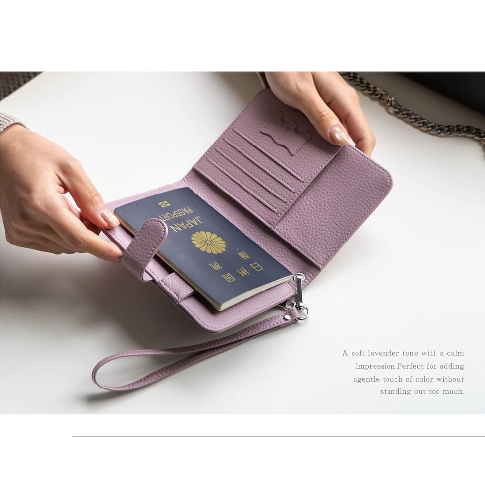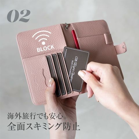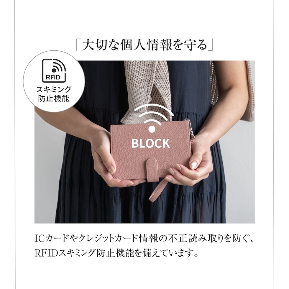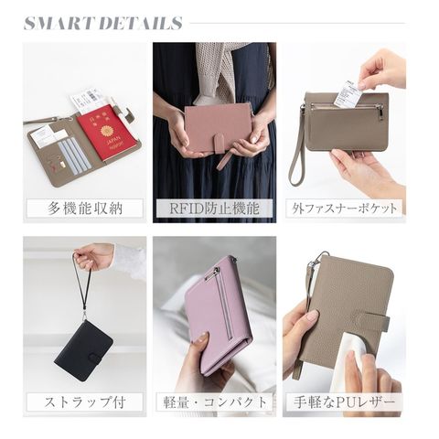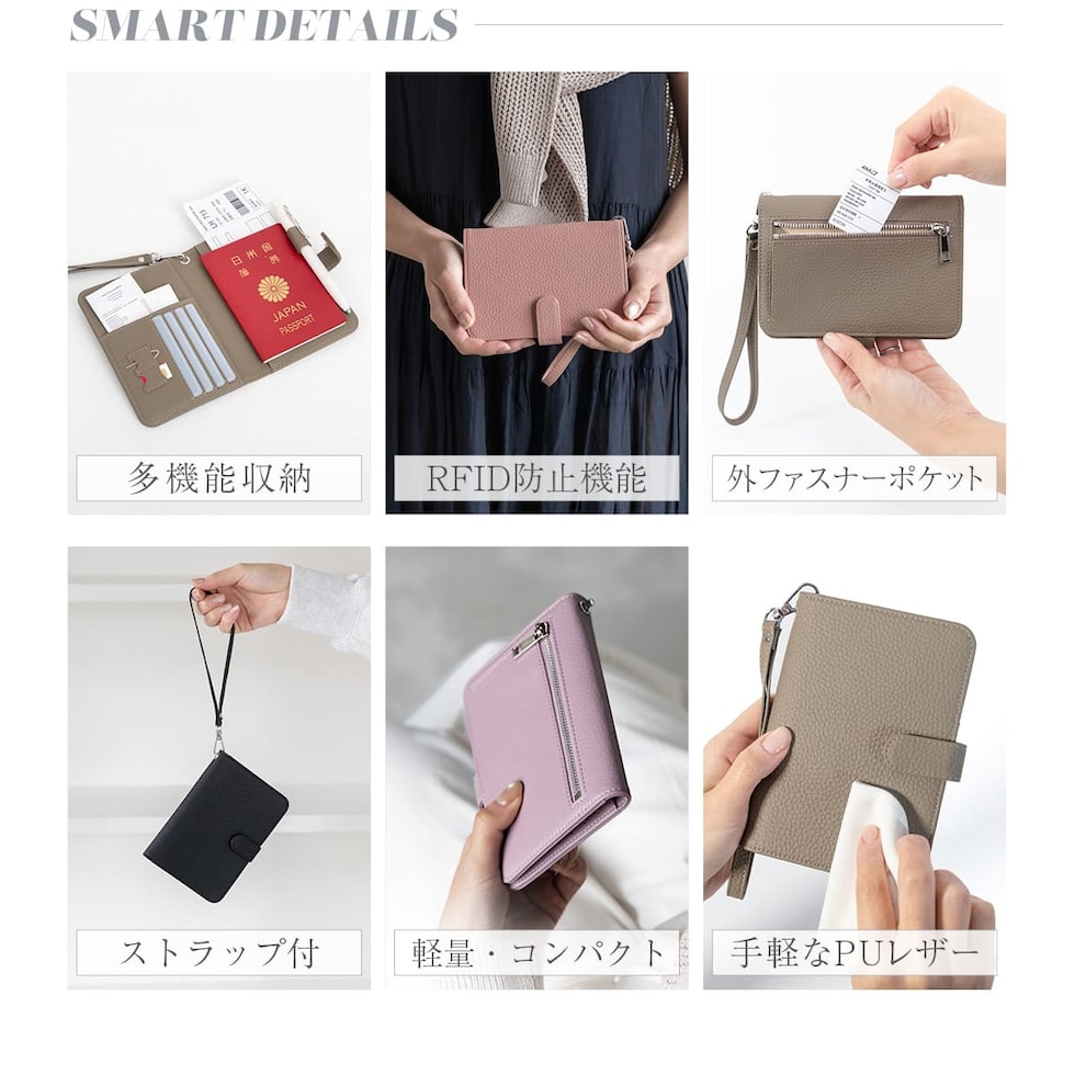 水気に強くお手入れ簡単なPUレザー+スキミング防止素材で中身をしっかり守ります。ハンドストラップ、ペンホルダー、マチ付きで大きく開くファスナーポケットなど、あったら嬉しい機能を詰め込みました。