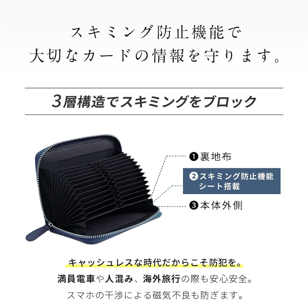 裏地に磁気遮断素材を織り込んだことで、大切な情報もしっかりとブロック