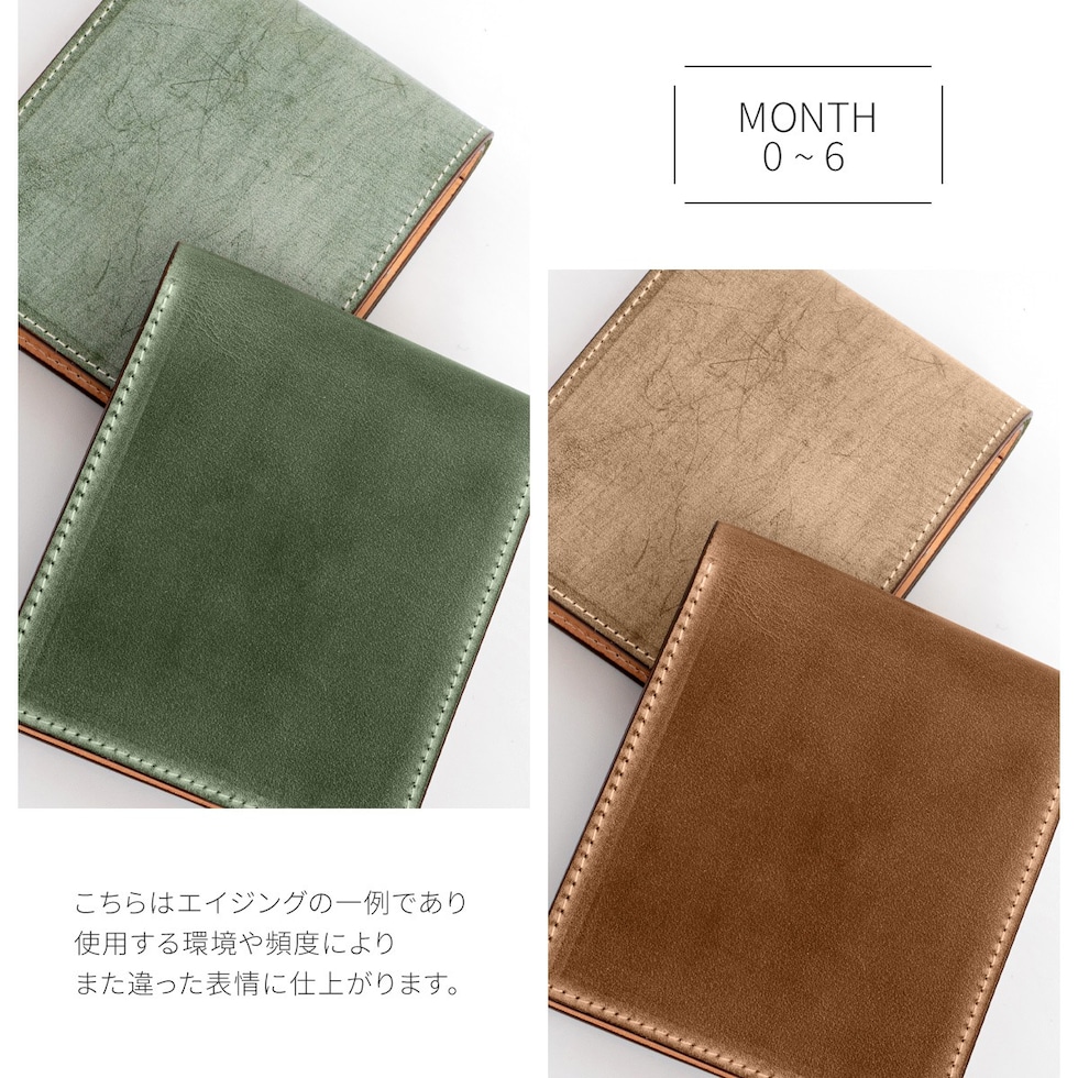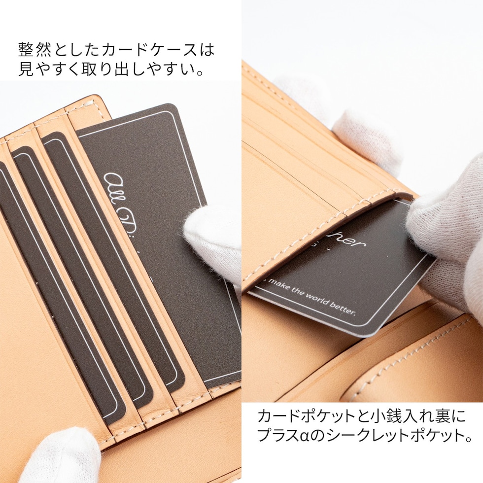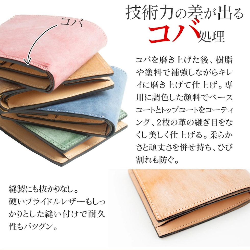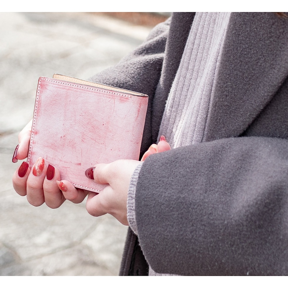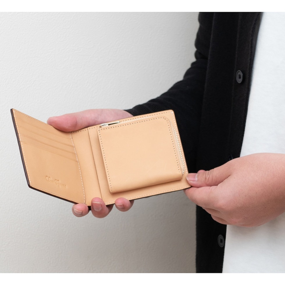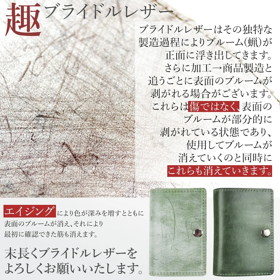 表地は個性的なブライドルレザー、内側はヌメ革、レザーの魅力を存分に味わえる二つ折り財布です。