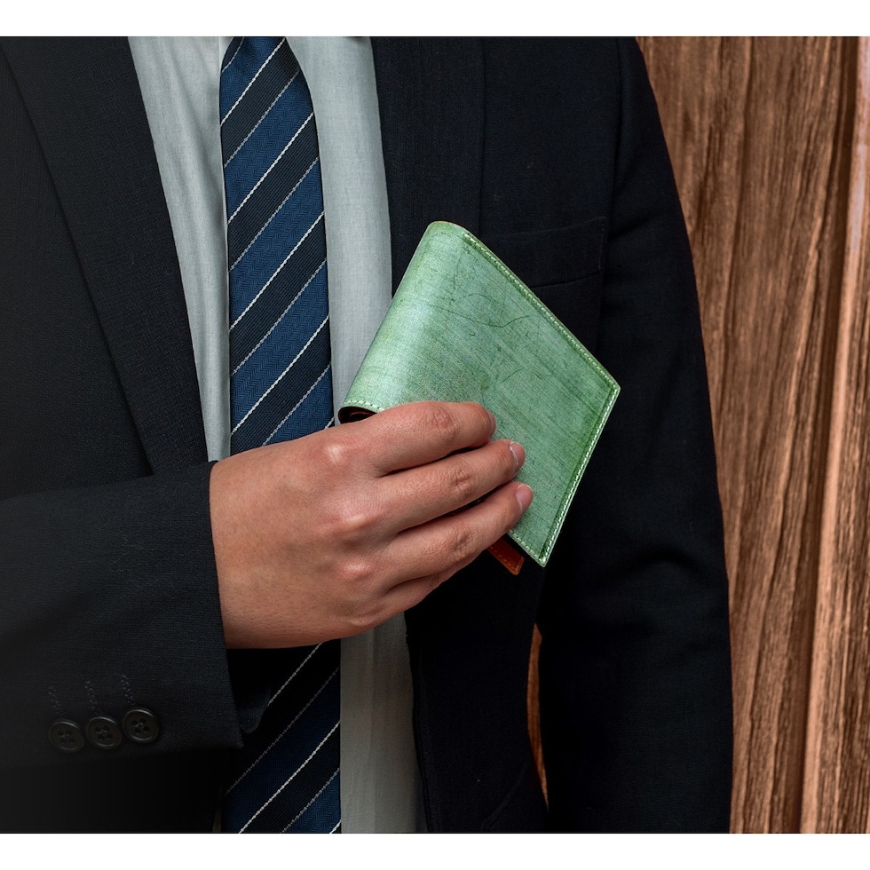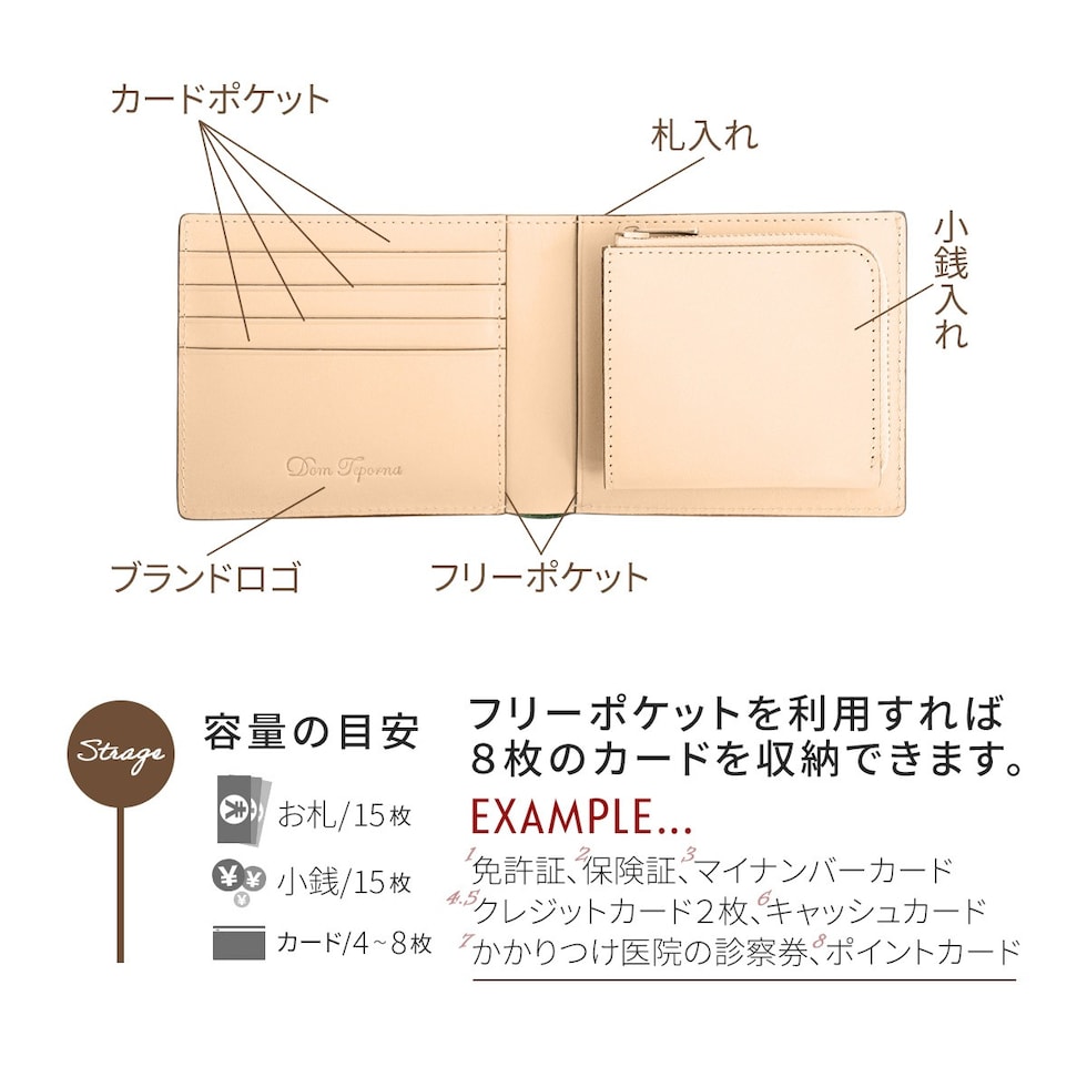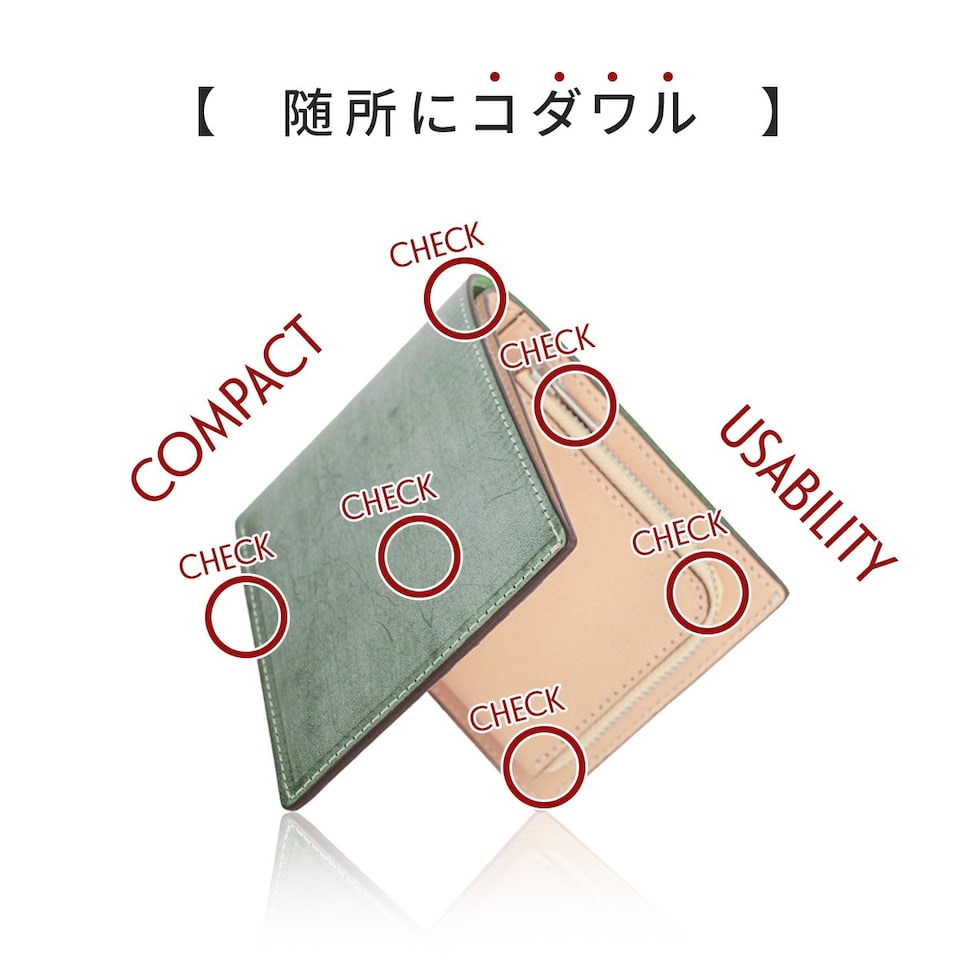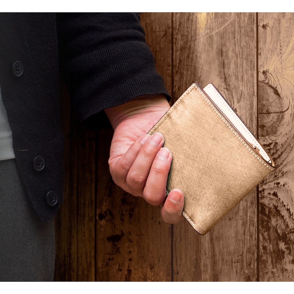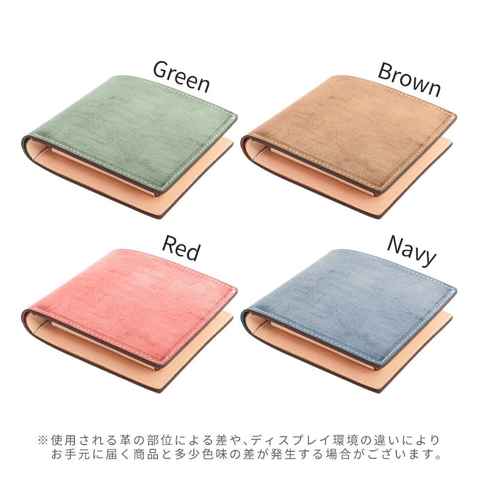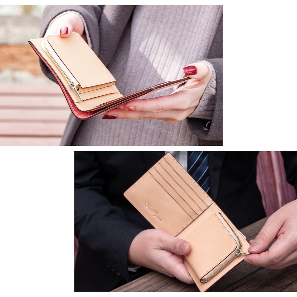 表地は個性的なブライドルレザー、内側はヌメ革、レザーの魅力を存分に味わえる二つ折り財布です。