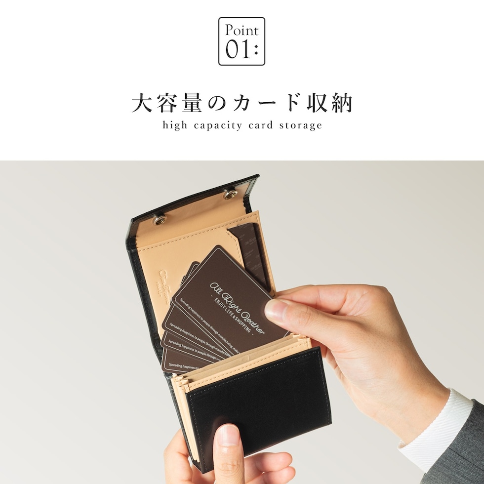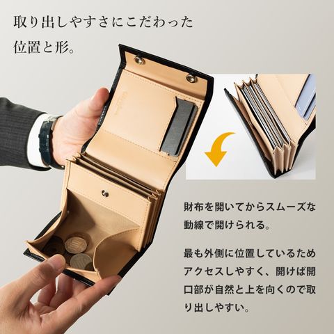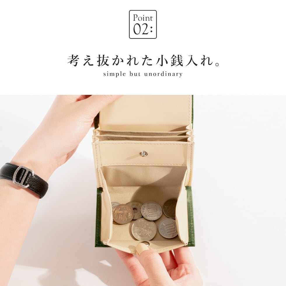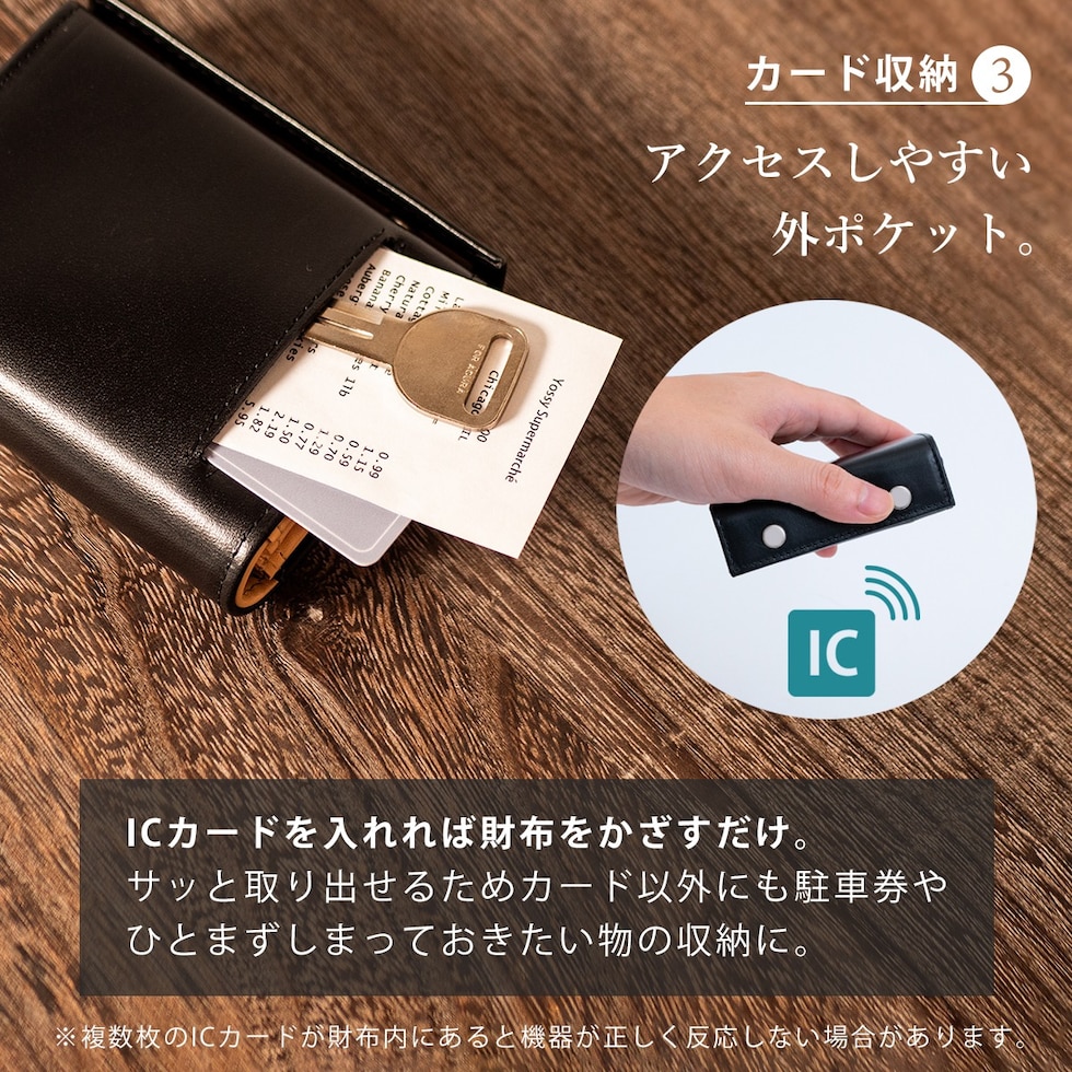 人気のお財布をさらにコンパクトに、使いやすく改良しました。絶妙な深さのマチ付き大容量カードポケット。フラップ部分に独立ポケットもプラス。小銭入れは大きく開くボックス型を採用しました。ICカード収納に最適なアウターポケットも付属しています。