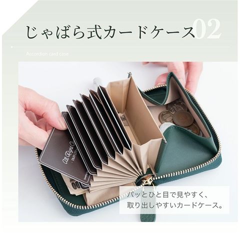 【カードも小銭もたっぷり収納】コンパクトなボディに、使いやすさのための工夫を詰め込みました。じゃばら式カードポケットでたっぷり大容量。ラウンドファスナーを開けば180度広がるので、使いたいカードが一目瞭然。小銭入れは便利なボックス型です。