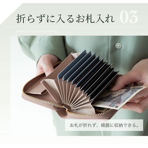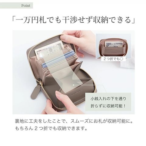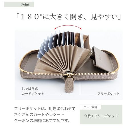 コンパクトなボディに、使いやすさのための工夫を詰め込みました。じゃばら式カードポケットでたっぷり大容量。ラウンドファスナーを開けば180度広がるので、使いたいカードが一目瞭然。小銭入れは便利なボックス型です。