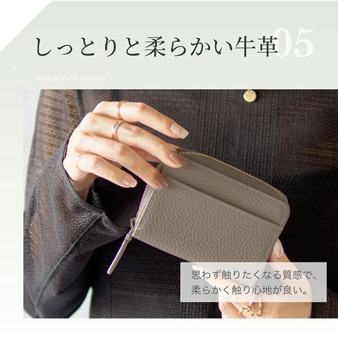 シボ感の手触りが良い上質なレザーを使用しています。カード・小銭・お札を入れてもすっきり収まり、メイン財布にもサブウォレットとしても、幅広く使えるアイテムです。